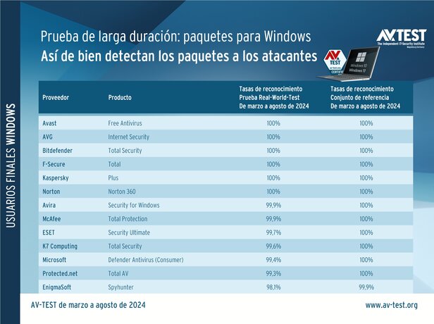 6 productos detuvieron al 100 por cien la gran oleada de atacantes en las dos partes de la prueba. Se trata de los paquetes de seguridad de Avast, AVG, Bitdefender, F-Secure, Kaspersky y Norton. Casi perfectas fueron las tasas de detección de los paquetes de Avira y McAfee con un 99,9 por ciento y de ESET con un 99,7 por ciento. Todos ellos, eso sí, detectaron el 100 por cien del set de referencia. Por ello, los productos mencionados recibieron los 6 puntos máximos.