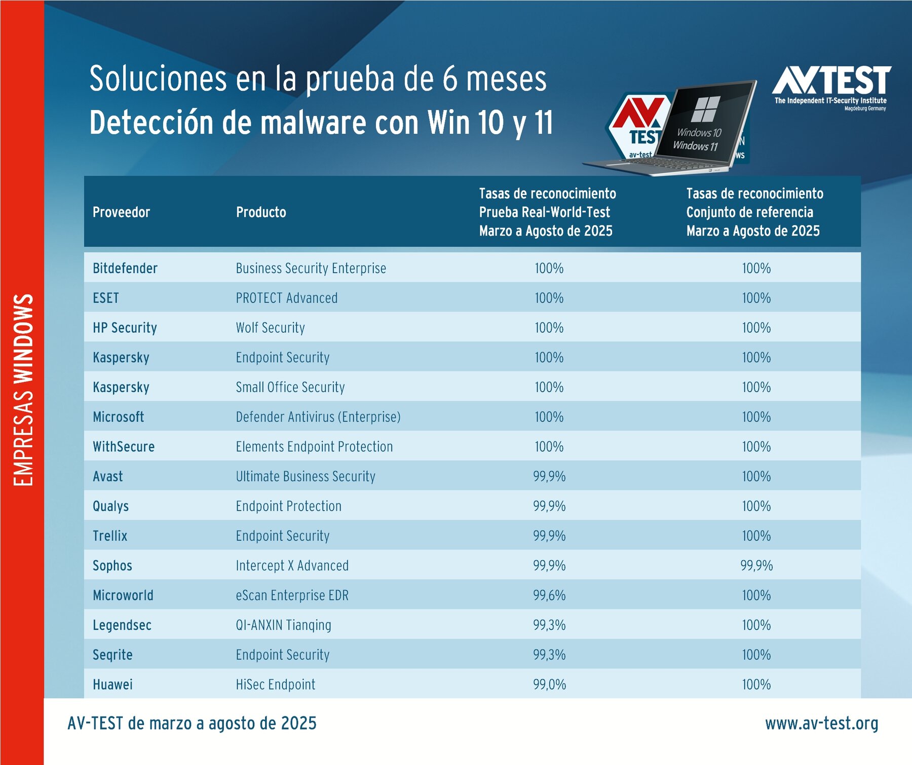 Por lo tanto, las empresas deben contar con la mejor ciberseguridad posible. Las soluciones de seguridad endpoint, a las que tan a menudo se da por muertas, siguen constituyendo el núcleo de la seguridad de una empresa. A esto se suma actualmente otra preocupación. Los sistemas Windows 10 ya no reciben actualizaciones de seguridad, salvo que se inscriban al programa de actualizaciones de seguridad extendidas (Extended Security Updates, ESU) de Microsoft. Algunas empresas recién están empezando a planificar la migración de los sistemas a Windows 11. Pero la cuestión es: ¿protege su solución endpoint de confianza los terminales con el nuevo sistema con tanta fiabilidad como con Windows 10? La reciente prueba de larga duración responde justo a esta pregunta respecto a 15 productos para empresas. La prueba se llevó a cabo de marzo a agosto de 2025 y examinó los productos con Windows 10 y 11.