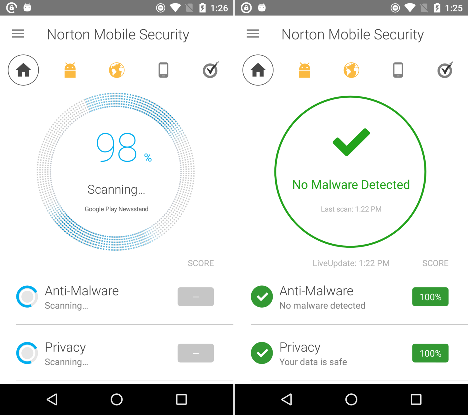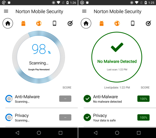 Un factor muy importante es el comportamiento de la aplicación de seguridad cuando está activa. Si consume continuamente potencia de la CPU, la batería se gasta enseguida y el dispositivo se vuelve más lento. Si la aplicación recaba muchos datos en segundo plano, no solo gasta batería, sino también el volumen de datos contratado. Las 16 aplicaciones superaron con honores todos estos aspectos de la prueba de larga duración. Solo las aplicaciones de Avast y Trend Micro gastaron demasiada batería en una de las pruebas parciales, pero en la siguiente versión de la aplicación ya habían corregido el fallo.