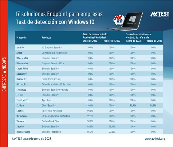 En la prueba de laboratorio realizada en enero y febrero de 2023 con Windows 10 participaron los productos para empresas de los siguientes fabricantes: AhnLab, Avast, Bitdefender (versión Endpoint y Ultra), Check Point, Kaspersky (versión Endpoint y Small Office), Malwarebytes, Microsoft, Seqrite, Sophos, Symantec, Trellix, Trend Micro, VMware, WithSecure y Xcitium.