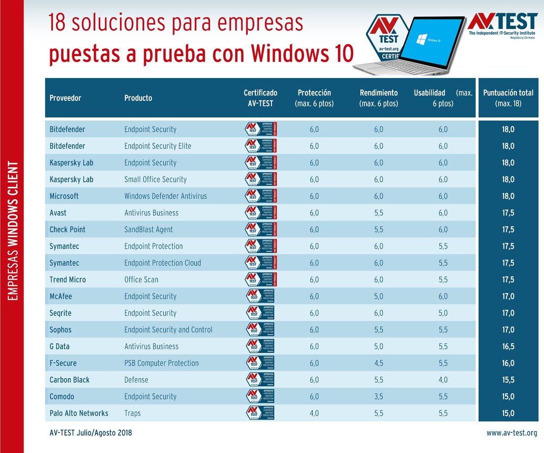 El laboratorio de AV-TEST ha examinado tres aspectos de 18 soluciones para empresas: la protección que ofrecen, la velocidad a la que trabajan (el rendimiento) y cómo influyen en la usabilidad del ordenador empresarial. El laboratorio podía otorgar como máximo 6 puntos en cada categoría. La máxima puntuación alcanzable en la prueba era, por tanto, 18 puntos.