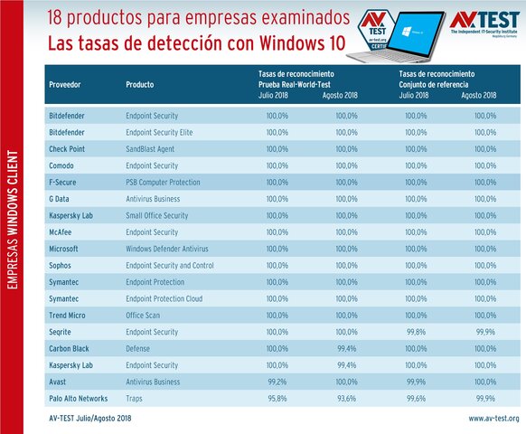 Todas las pruebas se llevaron a cabo entre julio y agosto de 2018. Cada producto tuvo que pasar dos veces por todos los tests durante ese periodo. A pesar de los grandes obstáculos a superar, el laboratorio ha podido otorgar a muchos productos no solo el certificado de su seguridad, sino también el galardón de PRODUCTO TOP. Esta distinción se otorga solo a productos que consiguen una calificación de 17,5 a 18 puntos. Ambos productos de Bitdefender y de Kaspersky Lab obtuvieron este reconocimiento, pero también Microsoft, Avast, Check Point, Trend Micro y Symantec con dos soluciones.