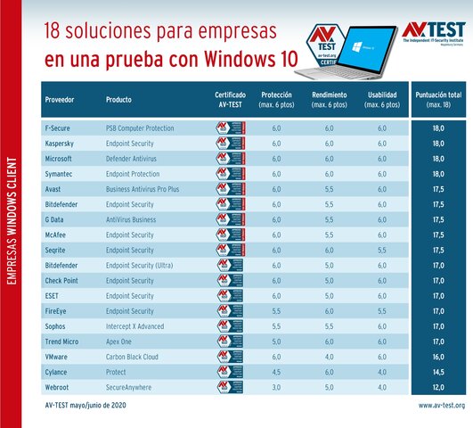 Los primeros puestos, con 18 puntos, los ocupan las soluciones de F-Secure, Kaspersky, Microsoft y Symantec. Con 17,5 puntos respectivamente las siguen los productos para empresas de Avast, Bitdefender (Endpoint Security), G Data, McAfee y Seqrite.
