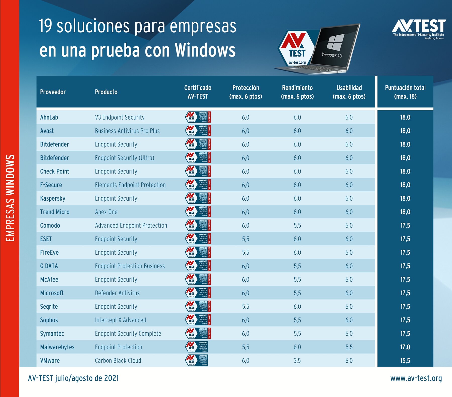 En esta ocasión, el laboratorio ha concedido esta distinción especial a 17 de los 19 productos examinados. Malwarebytes y VMware fueron los únicos que no consiguieron la distinción, pero sí recibieron el certificado AV-TEST de seguridad comprobada, al igual que el resto de participantes.