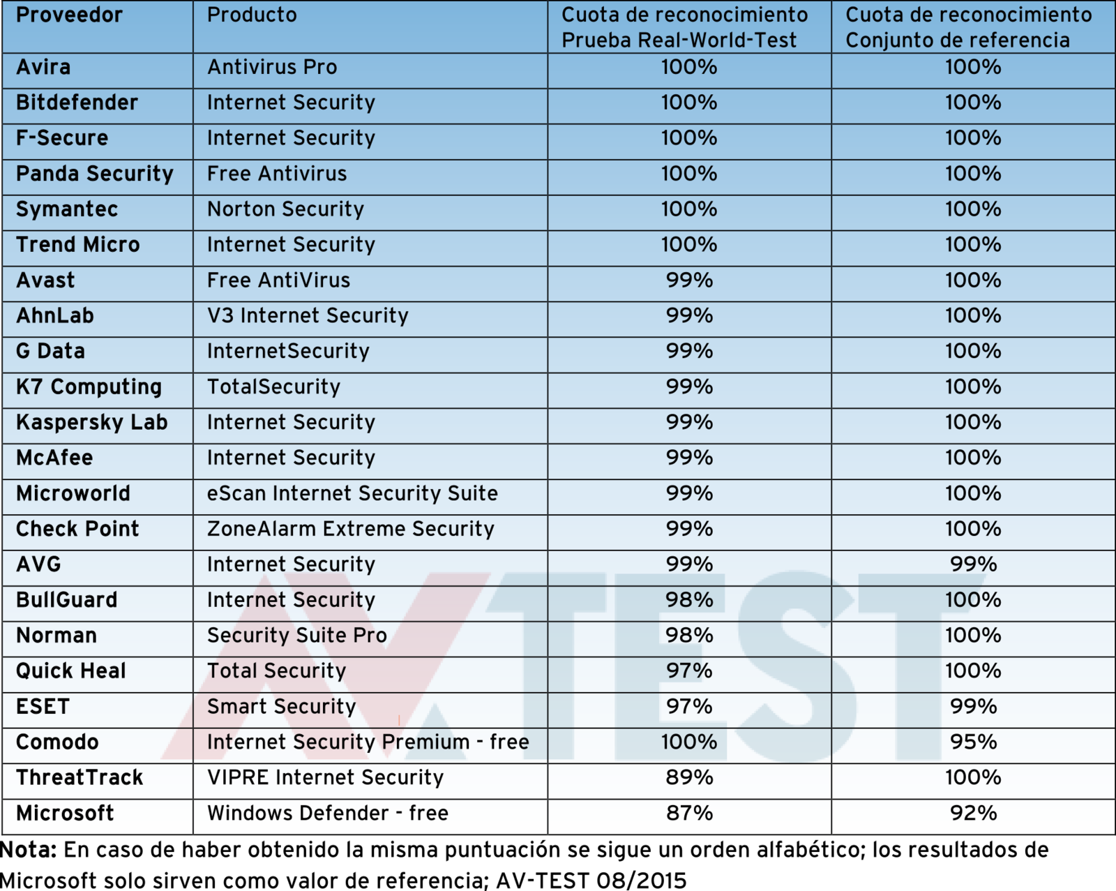 AV-TEST analizó 22 soluciones de seguridad y puede recomendar la mayoría de ellas (AV-TEST, versión de agosto de 2015).