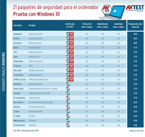 La distinción de PRODUCTO TOP con 18 puntos fue otorgada a las suites de seguridad de Kaspersky, McAfee y Symantec. Con 17,5 puntos y la distinción de PRODUCTO TOP les siguen los paquetes de seguridad de Avast, AVG, Avira, Bitdefender, F-Secure, Microsoft, Trend Micro y VIPRE Security.