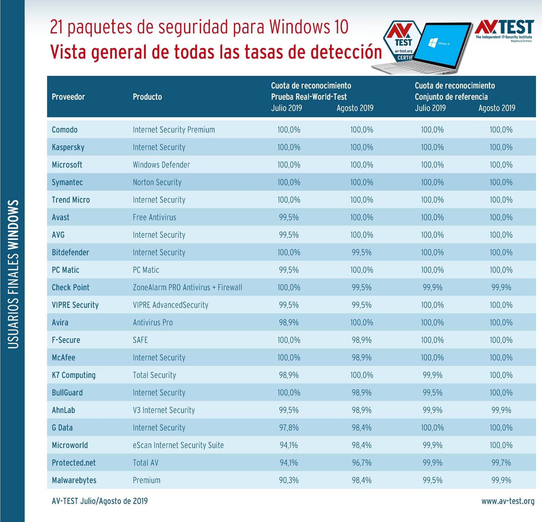 5 productos consiguieron detectar todos los códigos maliciosos al 100 por cien en todas las fases de la prueba. Son los procedentes de Comodo, Kaspersky, Microsoft, Symantec y Trend Micro. Con algunos pequeños fallos en el real-world test y una tasa de detección del 99,5 por ciento se situaron justo detrás del grupo en cabeza los paquetes de Avast, AVG, Bitdefender y PC Matic.