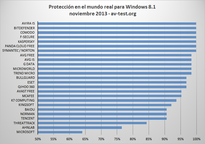 los 25 participantes para Windows 8.1 al completo tuvieron que demostrar su cuota de reconocimiento de malwares todavía desconocidos. La prueba tuvo una duración de dos meses. A continuación puede consultar el resultado de dos meses. A continuación puede consultar el resultado de noviembre de 2013.