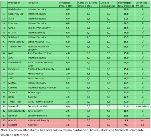 Las soluciones de Bitdefender y Kaspersky pueden presumir de haber alcanzado el total de los 18 puntos posibles en todas las categorías. Con 17,5 puntos, la versión de pago de Avira les sigue con un escaso margen.
