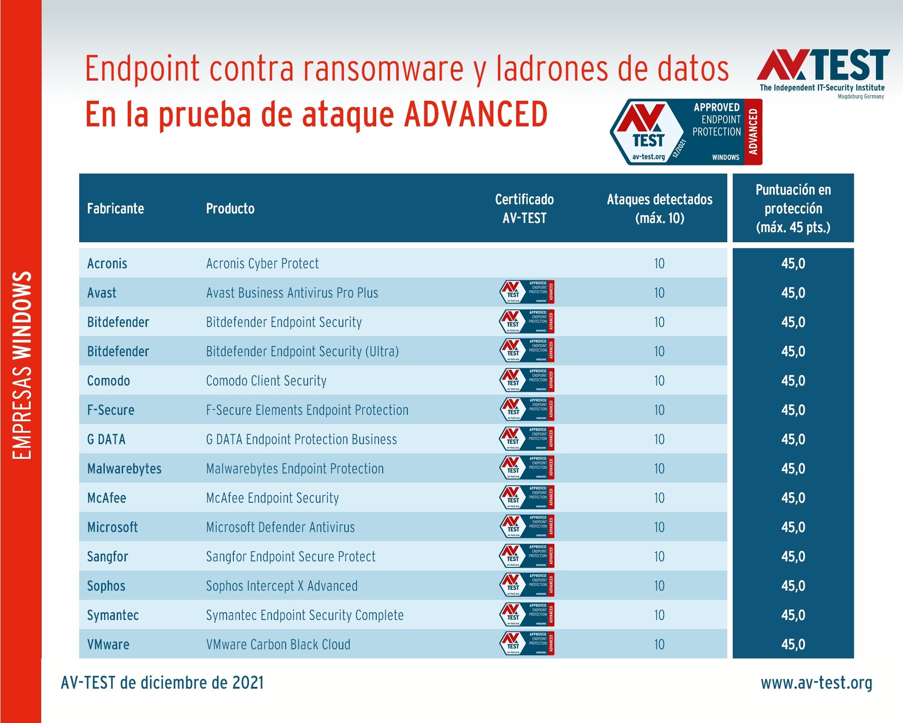 La prueba de diciembre no podría haber ido mejor para los productos de empresa. Los 14 productos obtuvieron un resultado perfecto en los 10 escenarios de la prueba y detuvieron todos los ataques. Por lo tanto, todos los productos Endpoint obtuvieron los 45 puntos máximos: Acronis Cyber Protect, Avast Business Antivirus Pro Plus, Bitdefender Endpoint Security, Bitdefender Endpoint Security (Ultra), Comodo Client Security, F-Secure Elements Endpoint Protection, G DATA Endpoint Protection Business, Malwarebytes Endpoint Protection, McAfee Endpoint Security, Microsoft Defender Antivirus, Sangfor Endpoint Secure Protect, Sophos Intercept X Advanced, Symantec Endpoint Security Complete y VMware Carbon Black Cloud.