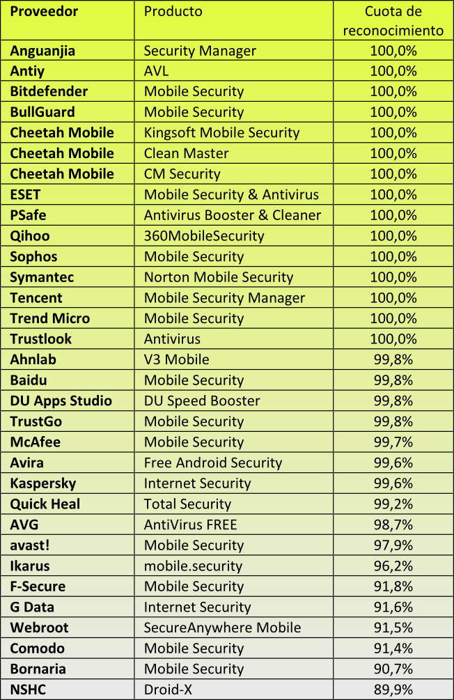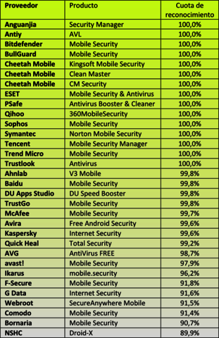 Casi la mitad de las aplicaciones de seguridad ensayadas reconocieron en la prueba el cien por cien de los atacantes (AV-TEST sep./oct. de 2014). Casi la mitad de las aplicaciones de seguridad ensayadas reconocieron en la prueba el cien por cien de los atacantes (AV-TEST sep./oct. de 2014).