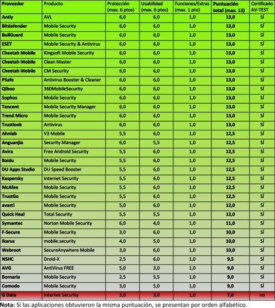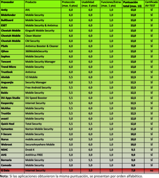 13 aplicaciones encabezan la tabla con 13 puntos cada una. Los proveedores son Antiy, Bitdefender, BullGuard, Cheetah Mobile (3 productos), ESET, PSafe, Qihoo, Sophos, Tencent, Trend Micro y Trustlook. La mayoría de las aplicaciones se pueden utilizar de forma totalmente gratuita. Unas pocas aplicaciones, tras una fase de prueba gratuita, ofrecen funciones premium especiales con recargo. Sin embargo, la función de protección no se desactiva tras la fase de prueba.