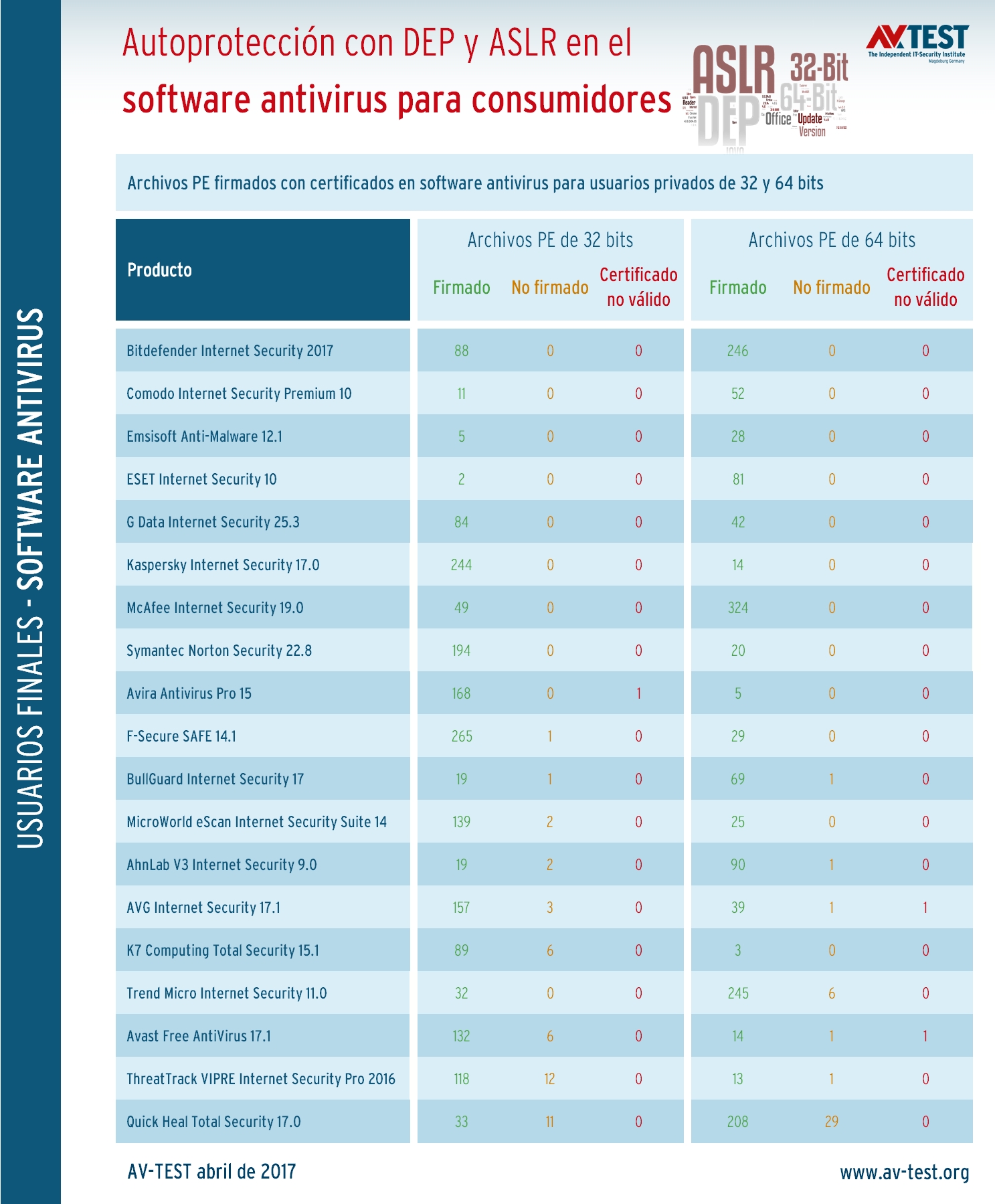 Certificados en el software para consumidores: Los fabricantes Bitdefender, Comodo, Emsisoft, ESET, G Data, Kaspersky Lab, McAfee y Symantec utilizan certificados válidos en todos sus archivos PE para 32 y 64 bits sin excepción. Muchos de estos fabricantes coinciden con los que utilizan ASLR y DEP al 100 por cien. En el caso de Avira, F-Secure, BullGuard, MicroWorld, Ahnlab y AVG, entre 1 y 5 archivos no están firmados o llevan un certificado no válido. En el caso de Trend Micro y Avast son entre 6 y 8 archivos los que no están correctamente firmados. Los productos de ThreatTrack y Quick Heal incluyen en su paquete incluso entre 13 y 40 archivos no protegidos.