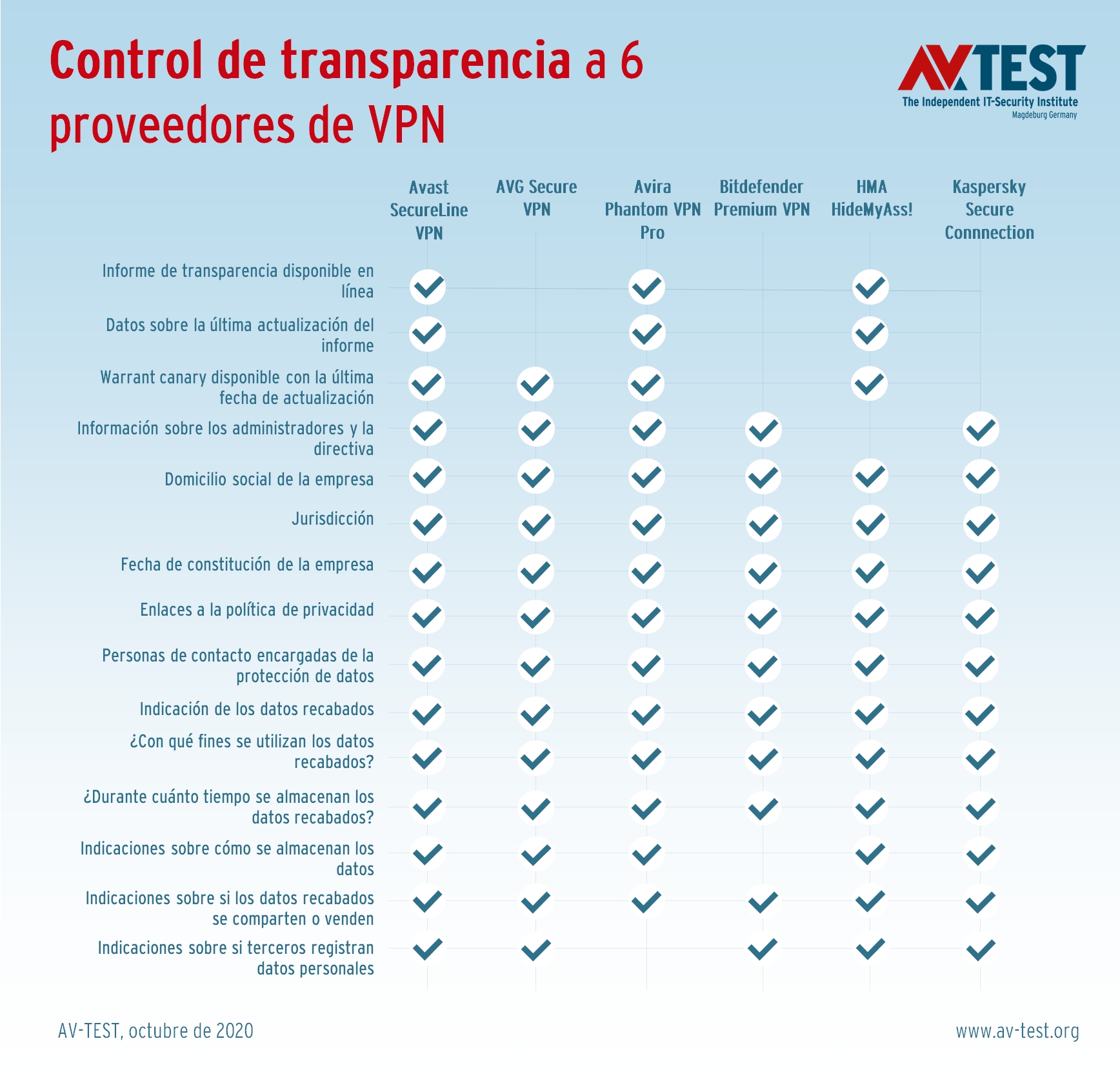 Como ya se ha mencionado en lo relativo a la descarga, es importante si y cómo almacena el proveedor de VPN los datos de conexión de sus clientes. La mayoría de los proveedores explica este aspecto en su página web de modo comprensible para cualquiera. Pero la empresa también debe revelar algo sobre sí misma. Por ejemplo, qué empresa se esconde tras el servicio y dónde está ubicada. U otra información, como los administradores, el domicilio social, la jurisdicción, así como indicaciones relativas al Reglamento General de Protección de Dates de la Unión Europea, abreviado RGPD. Este establece cómo se tienen que tratar los datos de los usuarios. Todos los proveedores ponen también estos datos a disposición de los usuarios. Sin embargo, solo Avast, Avira y HMA publican un informe de transparencia.