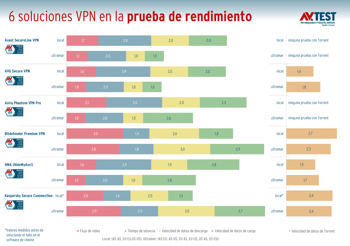 El uso de redes Torrent es, desde el punto de vista técnico, una buena idea, ya que, en este tipo de red, cada ordenador de usuario con el correspondiente software Torrent viene a ser también un servidor. Mediante Torrent se dividen y distribuyen archivos grandes en muchos bloques pequeños. Para no sobrecargar los servidores distribuidores, los usuarios de los ordenadores reenvían los bloques ya recibidos a otros que los busquen. Quien quiera moverse de forma segura en una red de este tipo, puede usar también VPN. La mayoría de los paquetes examinados ofrecen ayuda para hacerlo. Avira y Avast aún no han implementado por completo la compatibilidad con Torrent. Algunos de sus servidores todavía no son compatibles con el protocolo Torrent. Por eso no contamos con datos de prueba. Solo Bitdefender y Kaspersky demostraron un buen rendimiento o throughput a nivel “local” e “ultramar”, por lo que obtuvieron entre 2,3 y 2,7 puntos. AVG y HMA pueden gestionar conexiones Torrent con VPN, pero su rendimiento deja que desear y solo consiguieron de 1,4 a 1,8 puntos.
