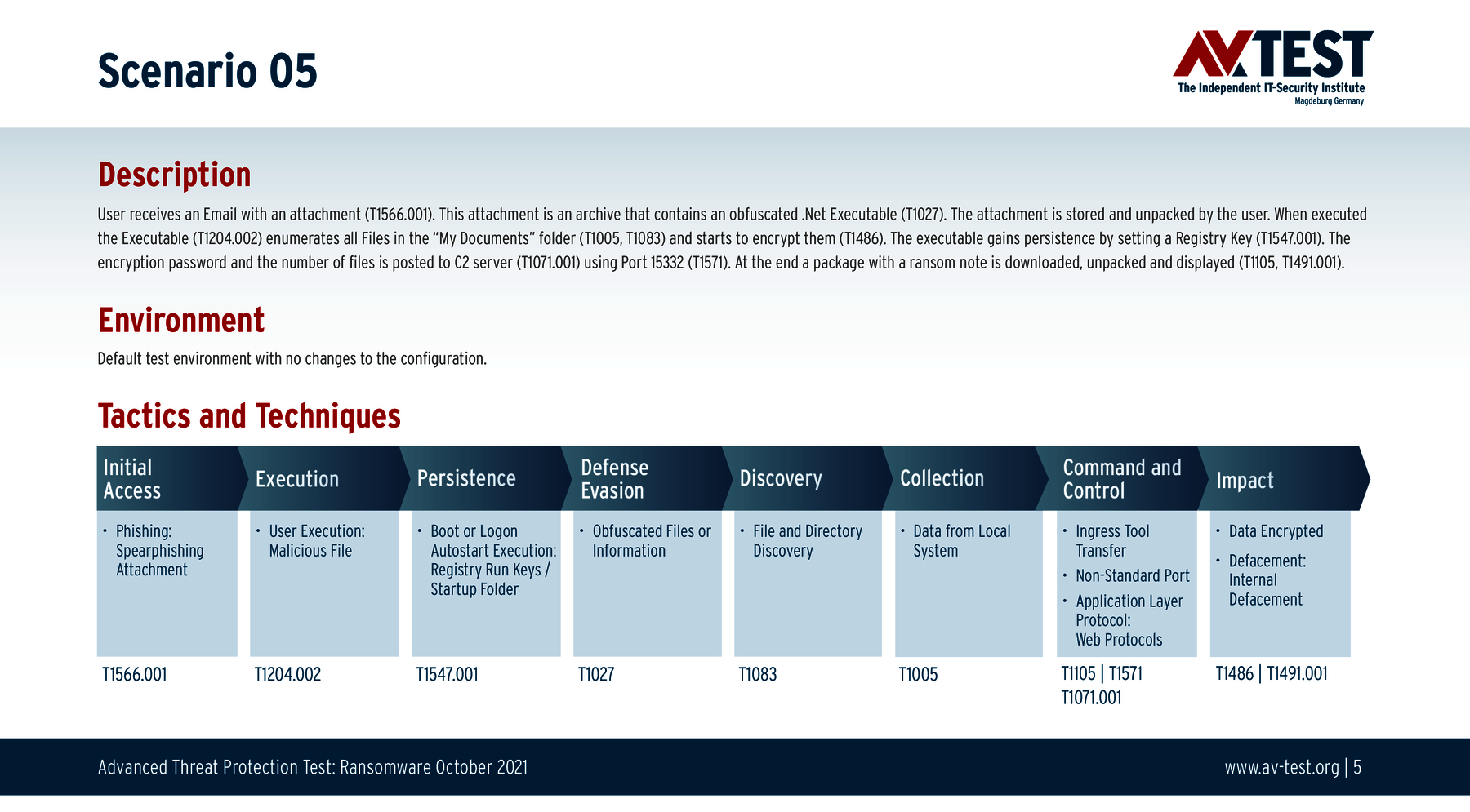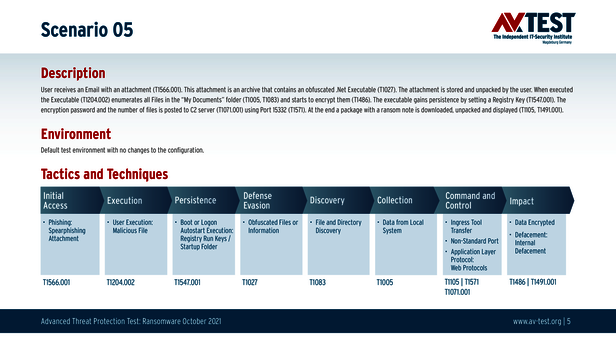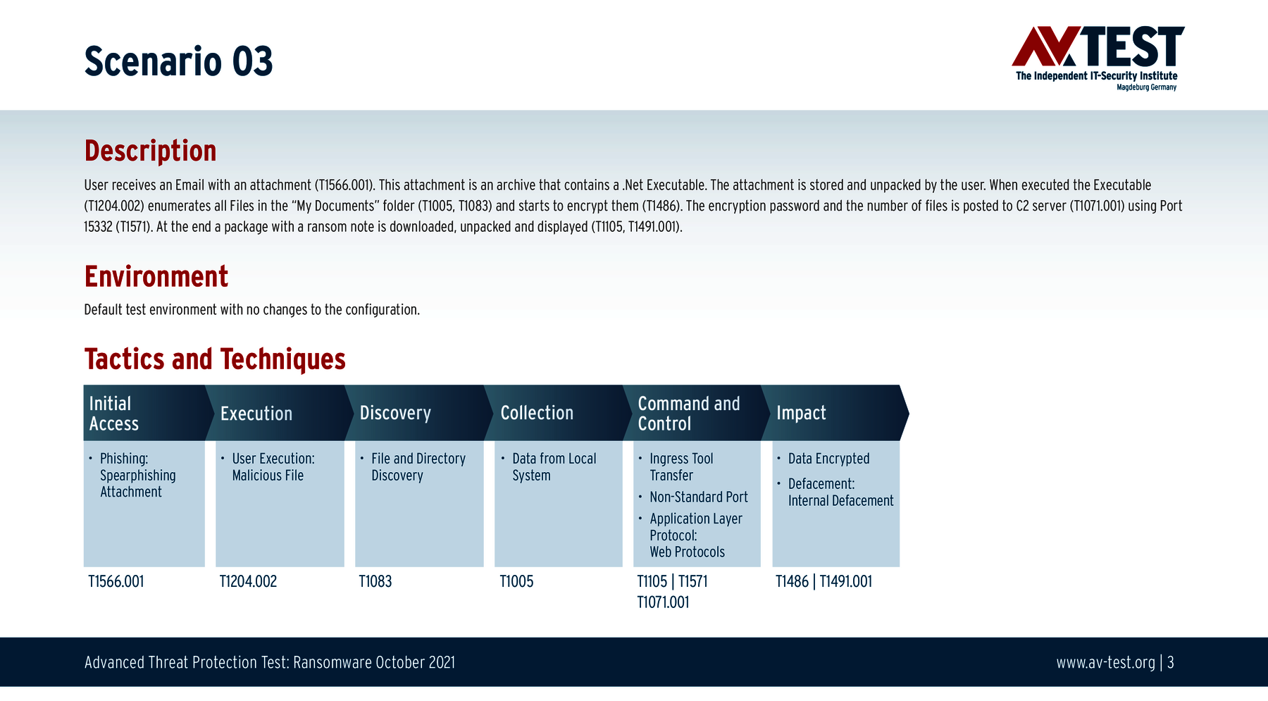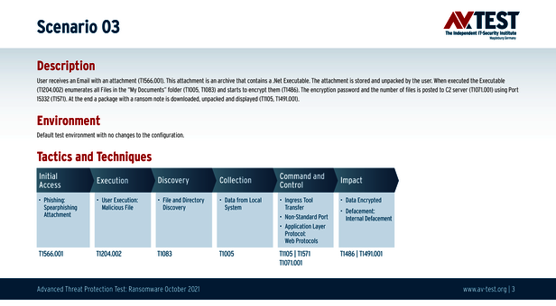 Las pruebas de seguridad clásicas muestran lo bien que los paquetes de seguridad se defienden contra decenas de miles de troyanos, virus y similares. Pero, ¿qué pasa si ataca un malware nuevo? ¿Lo detectarían, bloquearían y eliminarían? ¿Es posible evitar por completo su ejecución o quedan al final algunos archivos codificados, como es el caso en ataques de ransomware? Estas cuestiones las aclara la actual prueba de laboratorio de AV-TEST, en la que cada paquete de seguridad tiene que enfrentarse a 10 escenarios reales de ataques con ransomware. Para que cualquier lector pueda comprender las pruebas, se registran todos los pasos del ataque con cada producto en gráficos especiales de la matriz de MITRE ATT&CK.