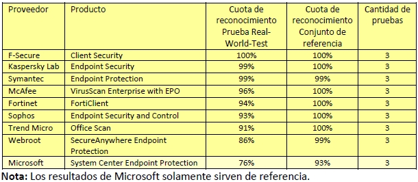 La prueba actual de larga duración de nueve soluciones de seguridad demuestra la continuidad de los productos disponibles de Fortinet, F-Secure, Kaspersky Lab, McAfee, Sophos, Symantec, Trend Micro y Webroot. AV-TEST también ha probado la solución de seguridad para terminales de Microsoft, pero no la ha puntuado, por lo que solamente tiene un valor comparativo. Pues esta solución, no es un producto en sí, sino que es un componente de Microsoft System Center 2012. Los que posean una licencia Manager Suite tienen automáticamente el módulo System Center Endpoint Protection 2012. Sin el Management Suite, el paquete de protección para terminales no funcionaría.