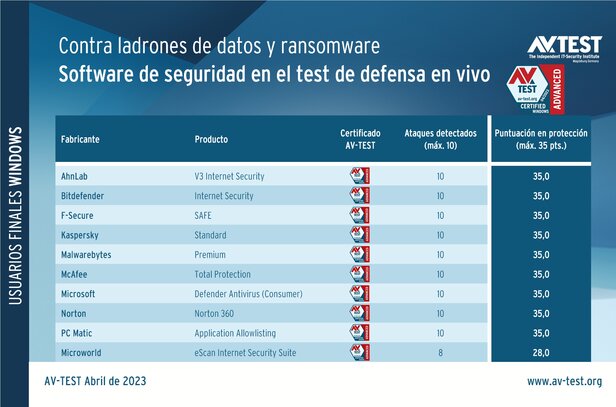 Todo producto para usuarios privados que consigue un 75 por ciento de los 35 puntos posibles en la puntuación de protección, es decir, 26,3 puntos, recibe el certificado “Advanced Certified“. Todos los productos participantes en esta prueba consiguieron el certificado.
