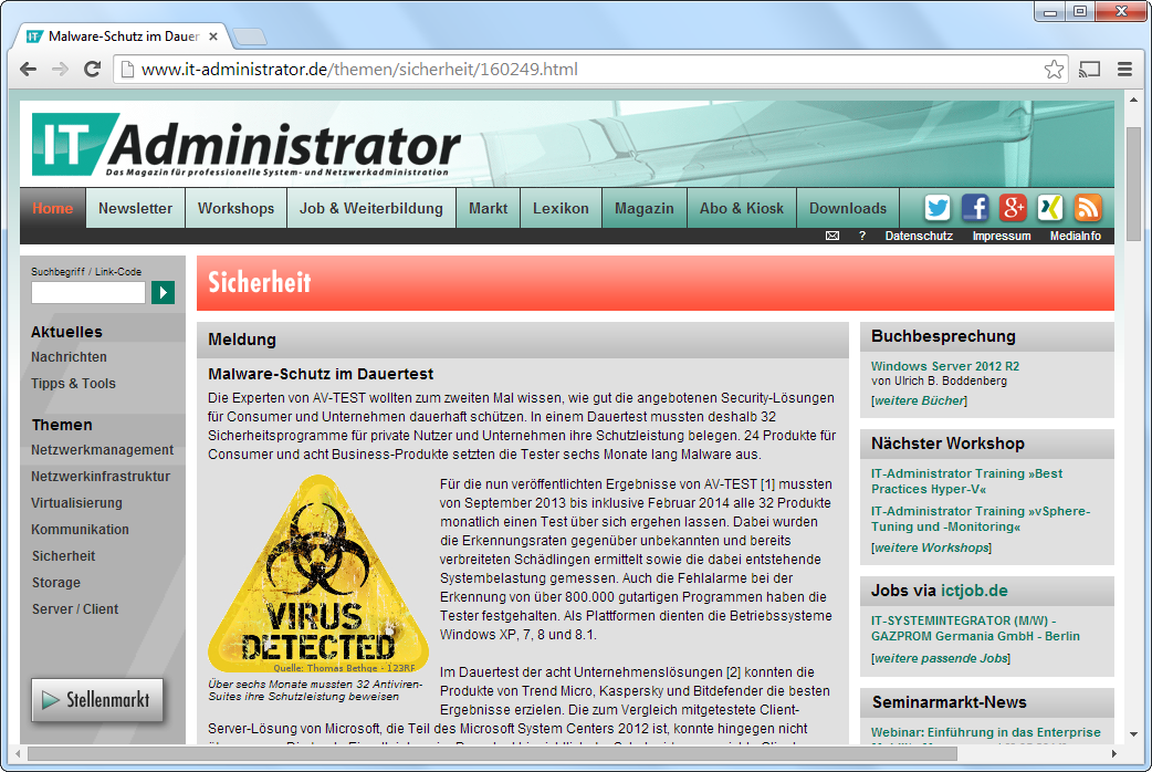 Muchos medios de comunicación de la prensa escrita y en línea se hacen eco todos los meses de los resultados actualizados de las pruebas efectuadas por los laboratorios de AV-TEST GmbH. Utilizan a menudo los valores de los expertos en seguridad como información básica para realizar comparaciones de productos. Algunas revistas, sin embargo, elaboran otras comparaciones de mercado interesantes, comentan el futuro desarrollo de los software antivirus o cuestionan los conceptos de seguridad de los sistemas operativos. A continuación le ofrecemos una pequeña recopilación de publicaciones.