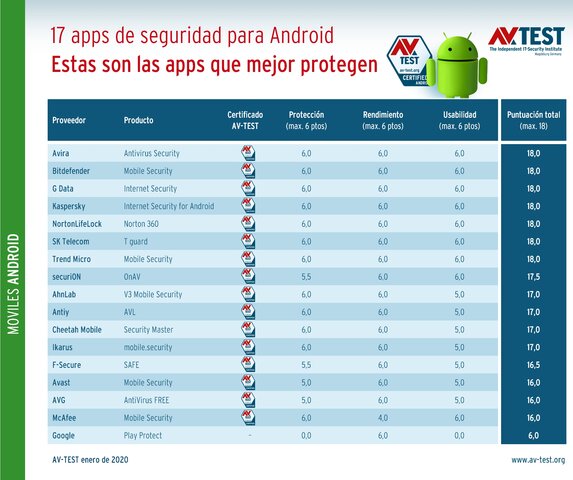 El laboratorio valora las aplicaciones en todas las categorías y puede otorgar hasta 6 puntos en tres ocasiones. El mejor resultado de 18 puntos lo consiguieron en esta prueba las aplicaciones de seguridad de Avira, Bitdefender, G Data, Kaspersky, NortonLifeLock, SK Telecom y Trend Micro. La aplicación de securiON las sigue muy de cerca con 17,5 puntos. Y otras 8 aplicaciones recibieron entre 17 y 16 puntos. Rezagada quedó Google Play Protect con solo 6 puntos en total. Esto no basta para recibir el certificado de AV-TEST. Todas las demás aplicaciones fueron merecedoras de suficientes puntos como para obtener el certificado que es testimonio de seguridad comprobada.