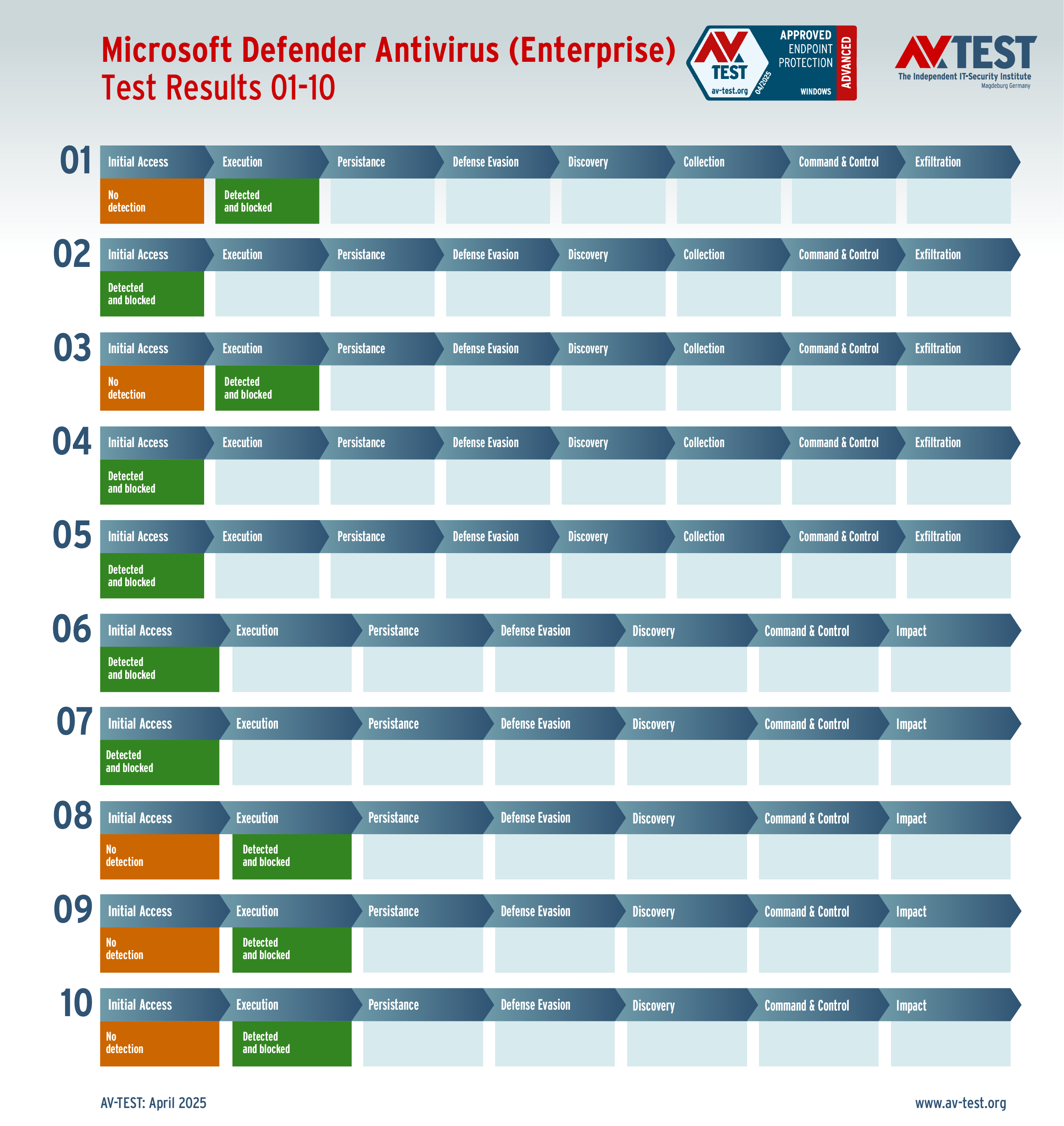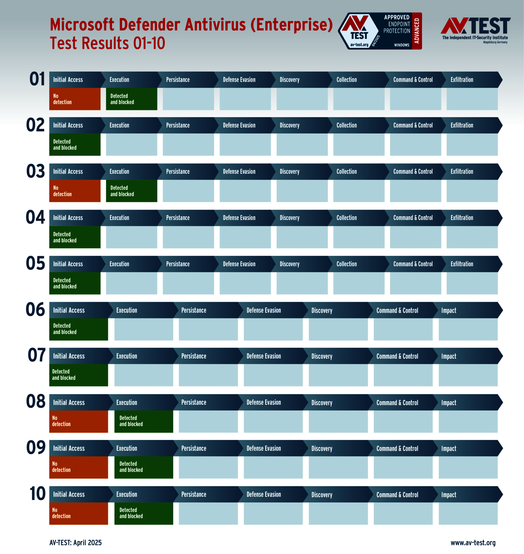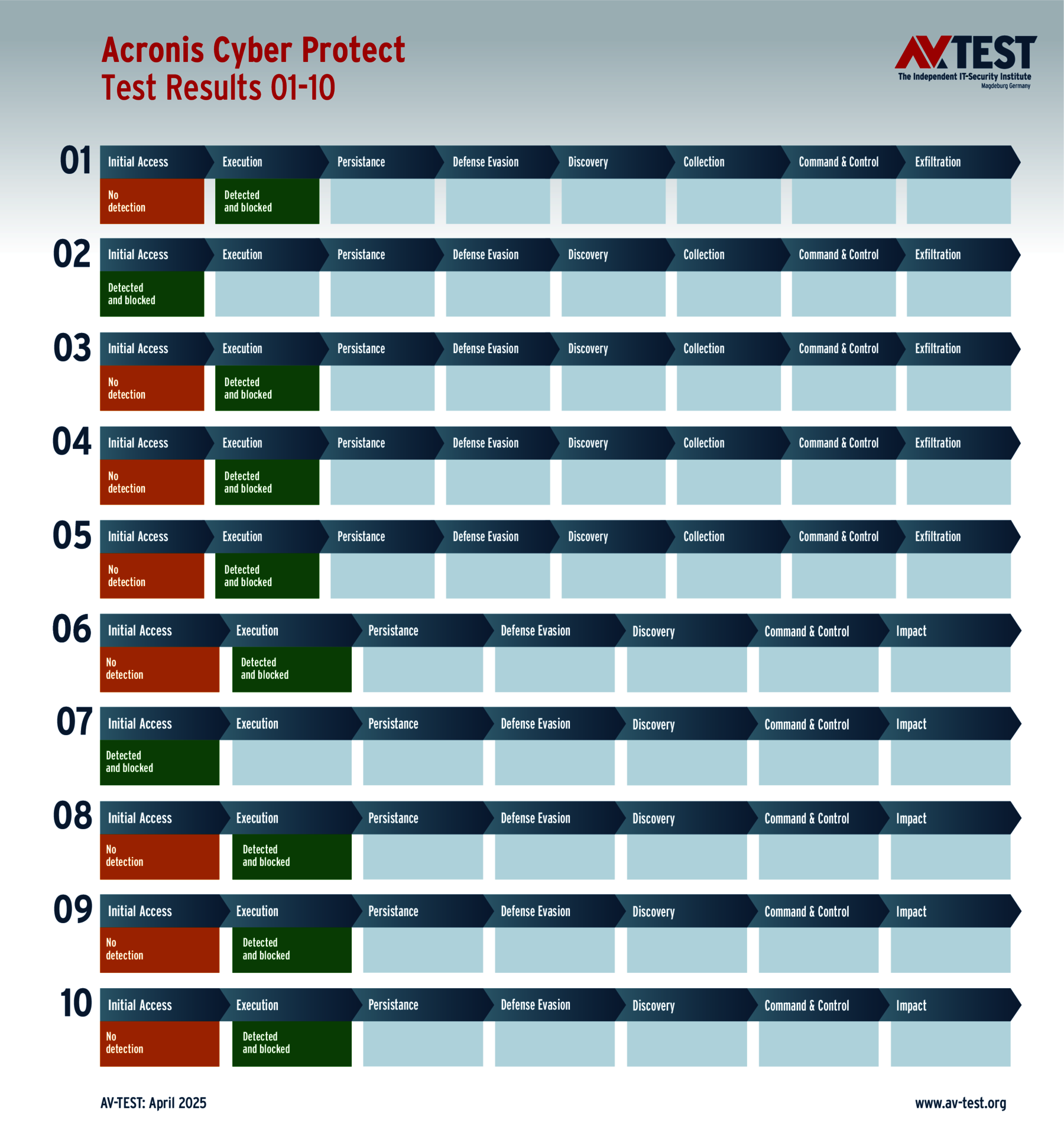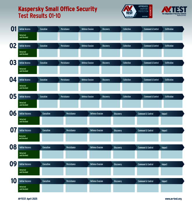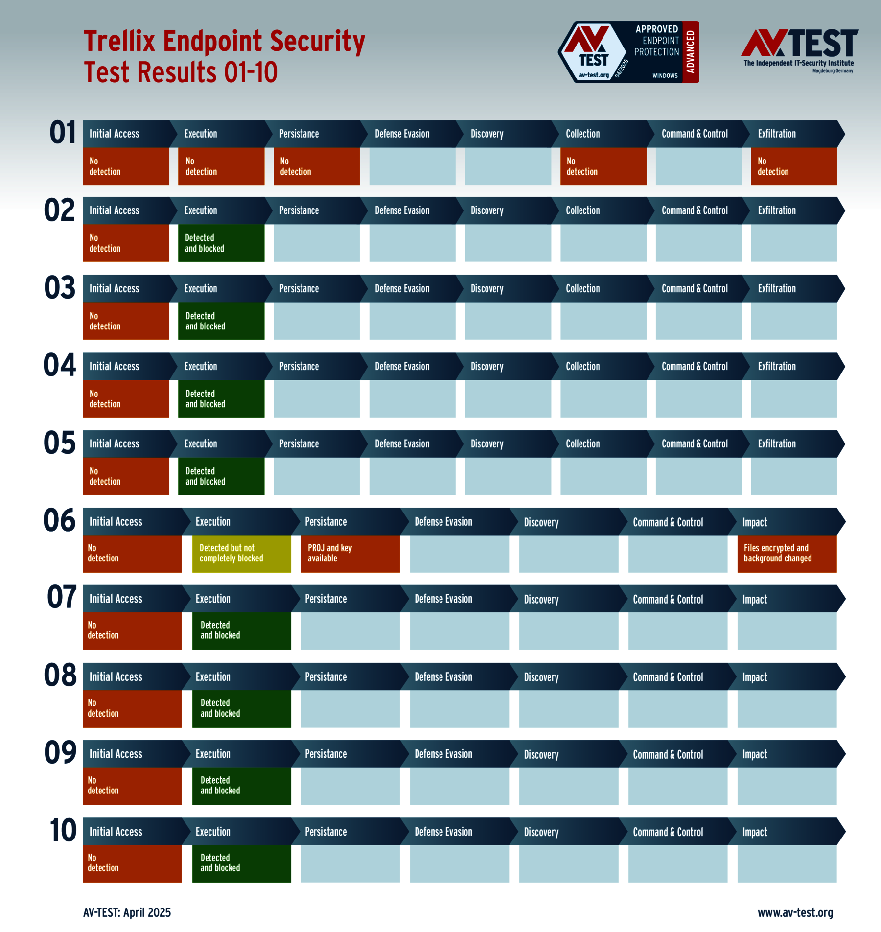 El laboratorio describe el transcurso de las acciones de defensa en una matriz basada en el estándar MITRE ATT&CK. Aunque un producto no detecte de inmediato al atacante, puede activar otras acciones de defensa posteriores y detener el ataque. La prueba muestra exactamente en qué paso lo consiguen o no.
