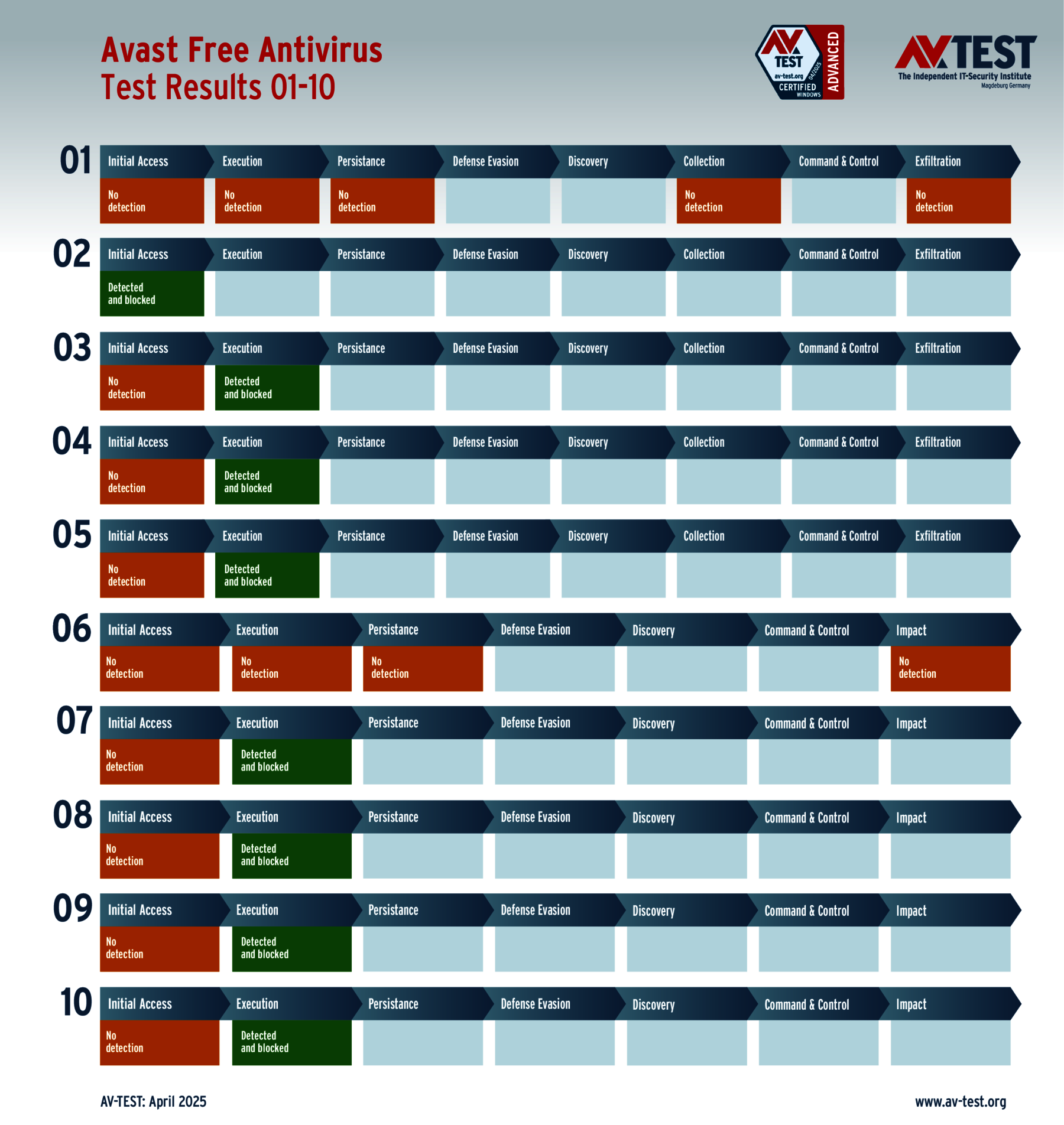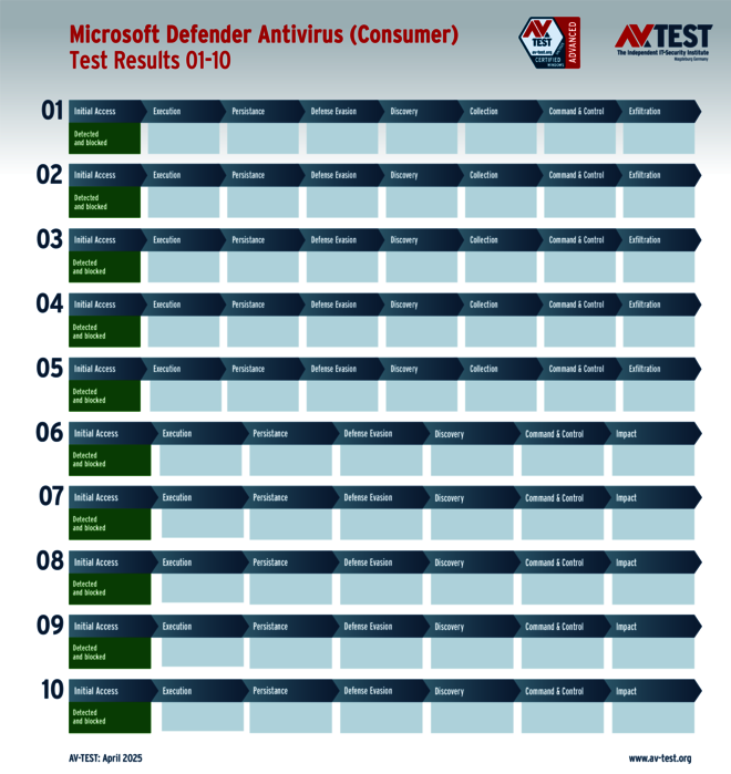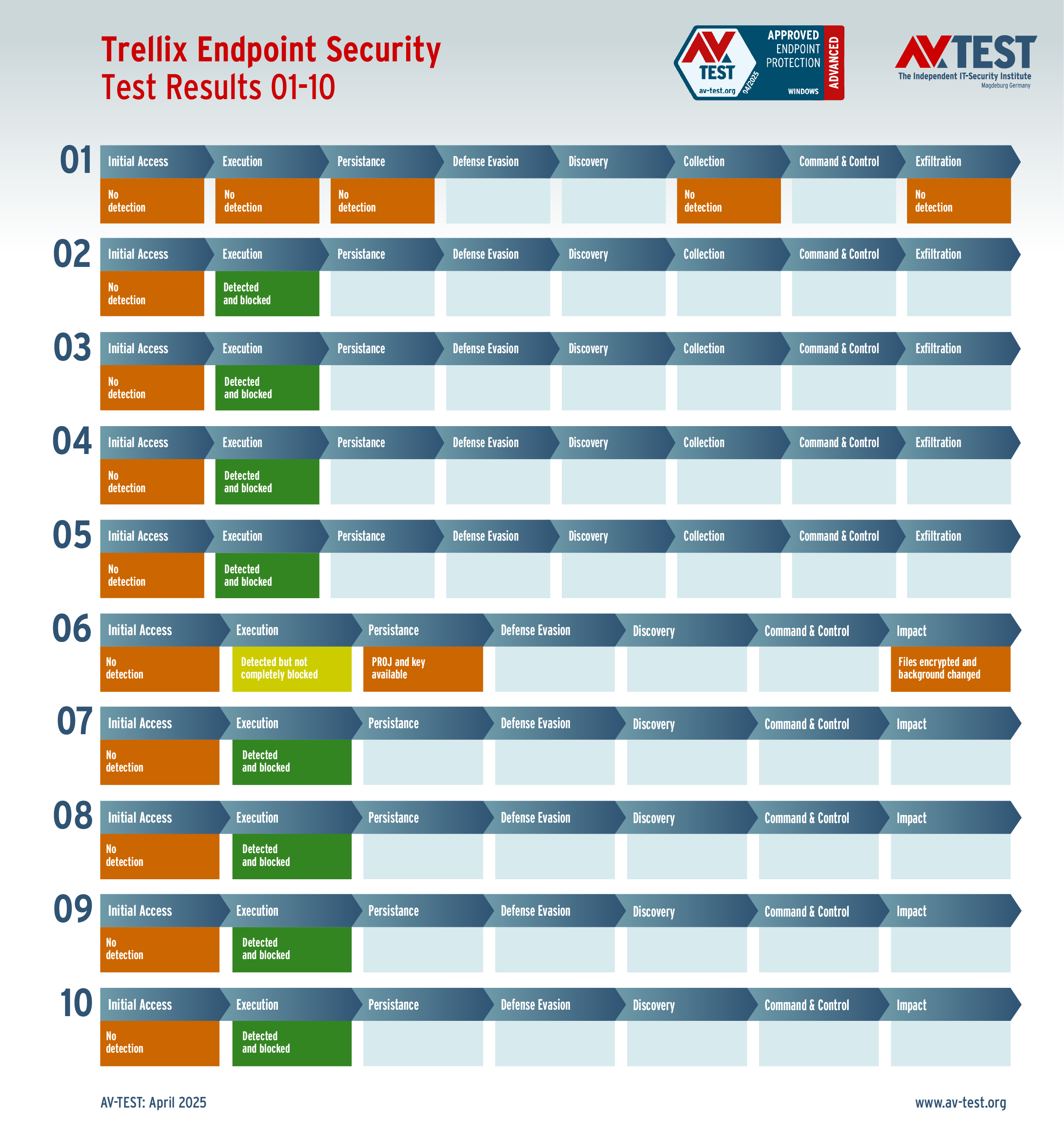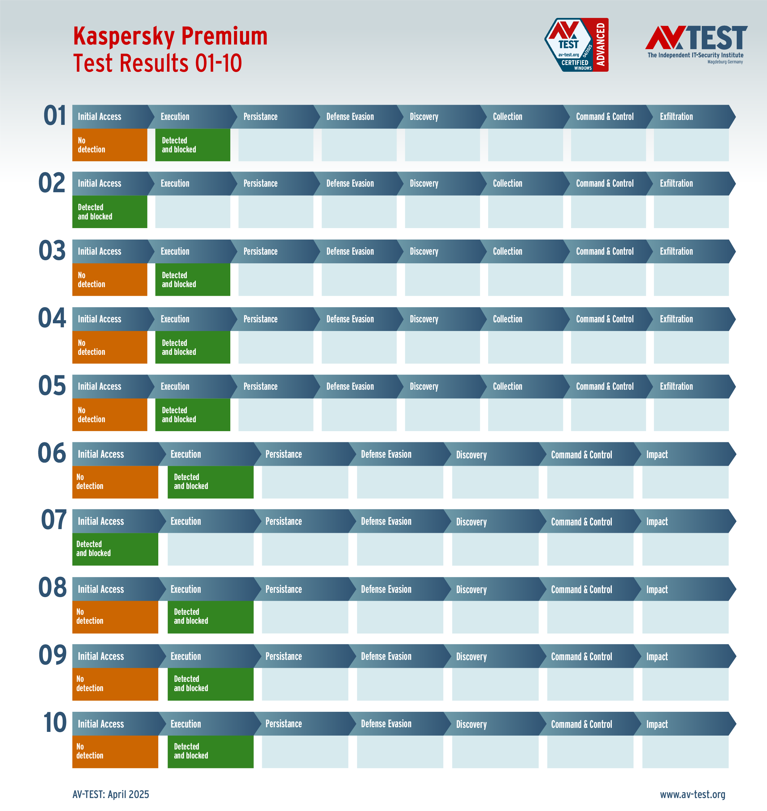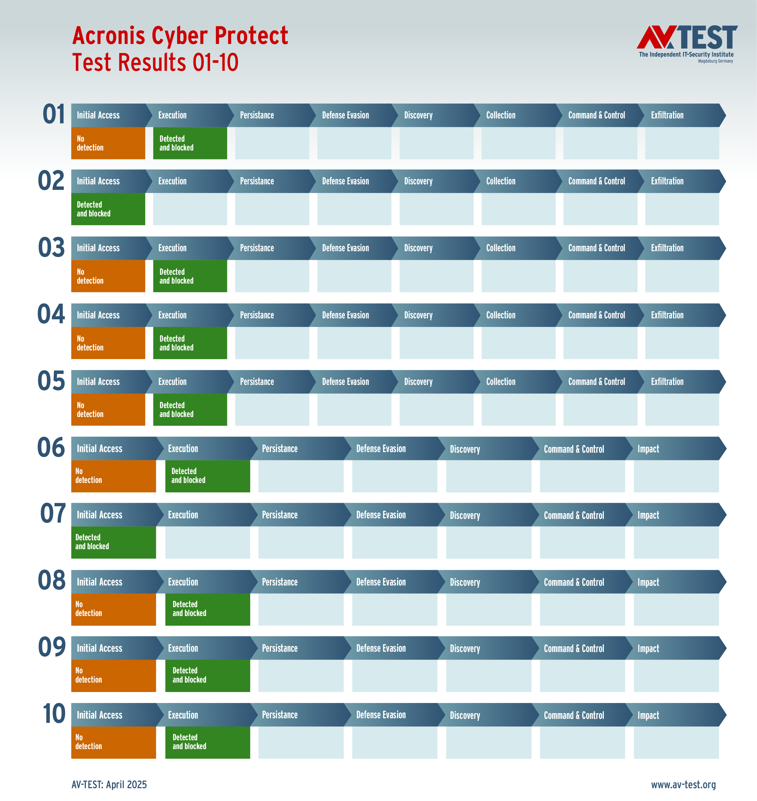 El laboratorio describe el transcurso de las acciones de defensa en una matriz basada en el estándar MITRE ATT&CK. Aunque un producto no detecte de inmediato al atacante, puede activar otras acciones de defensa posteriores y detener el ataque. La prueba muestra exactamente en qué paso lo consiguen o no.