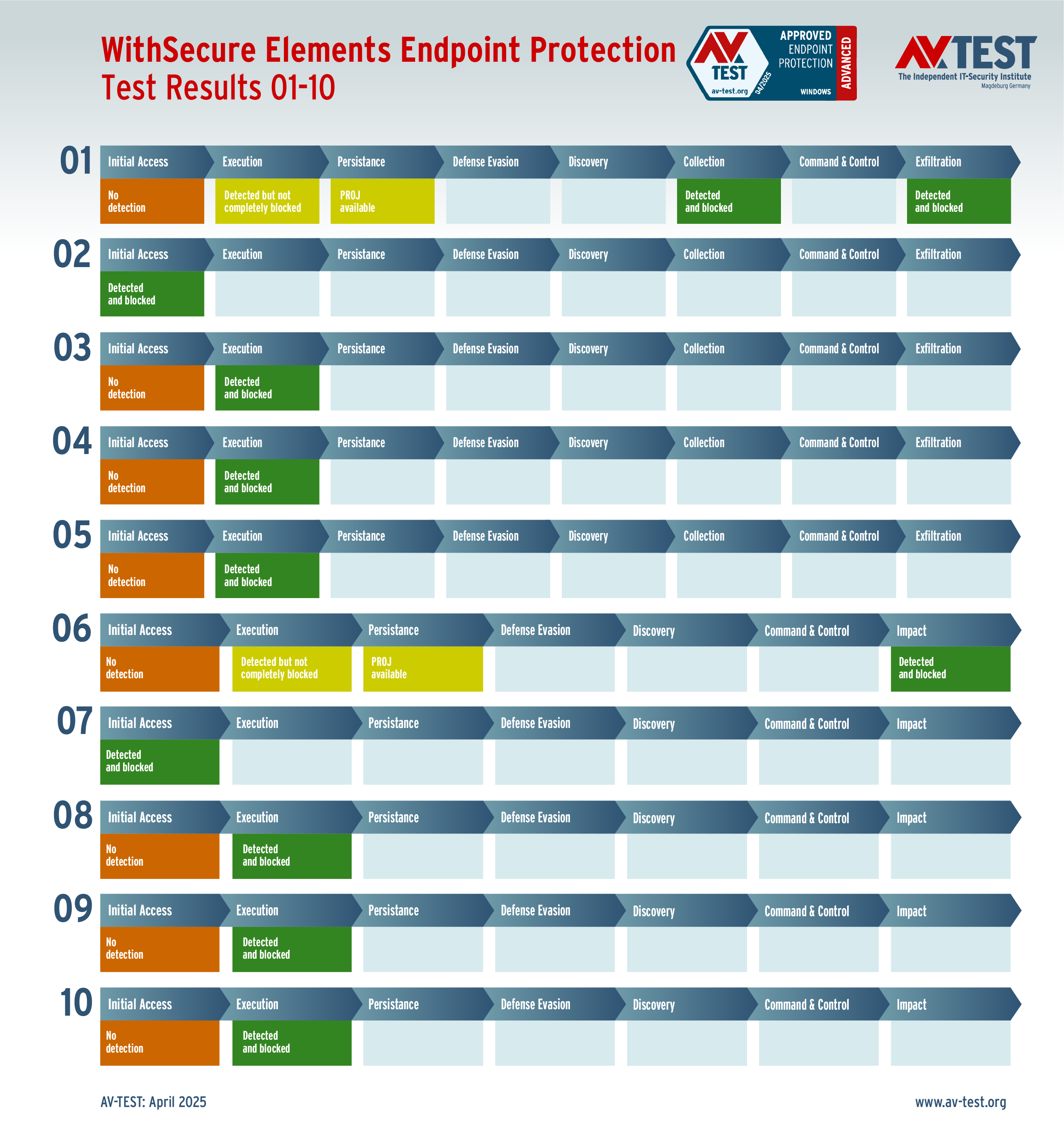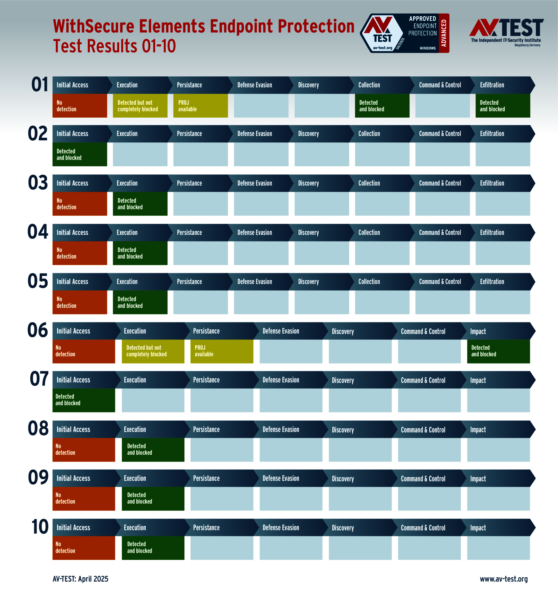 El paquete Endpoint de WithSecure también registró a los 10 atacantes, sin embargo tuvo problemas a continuación y no consiguió parar a un ladrón de datos identificado hasta varios pasos más adelante. Esto le costó un punto y solo recibió 3 de los 4 puntos posibles. También tuvo problemas con un ransomware y perdió otros puntos. Esta vez de nuevo detectó al atacante, pero no pudo detenerlo de inmediato. El producto de WithSecure no lo consiguió hasta pasos posteriores. Al final le quedaron 33 de los 35 puntos posibles para la puntuación en protección.