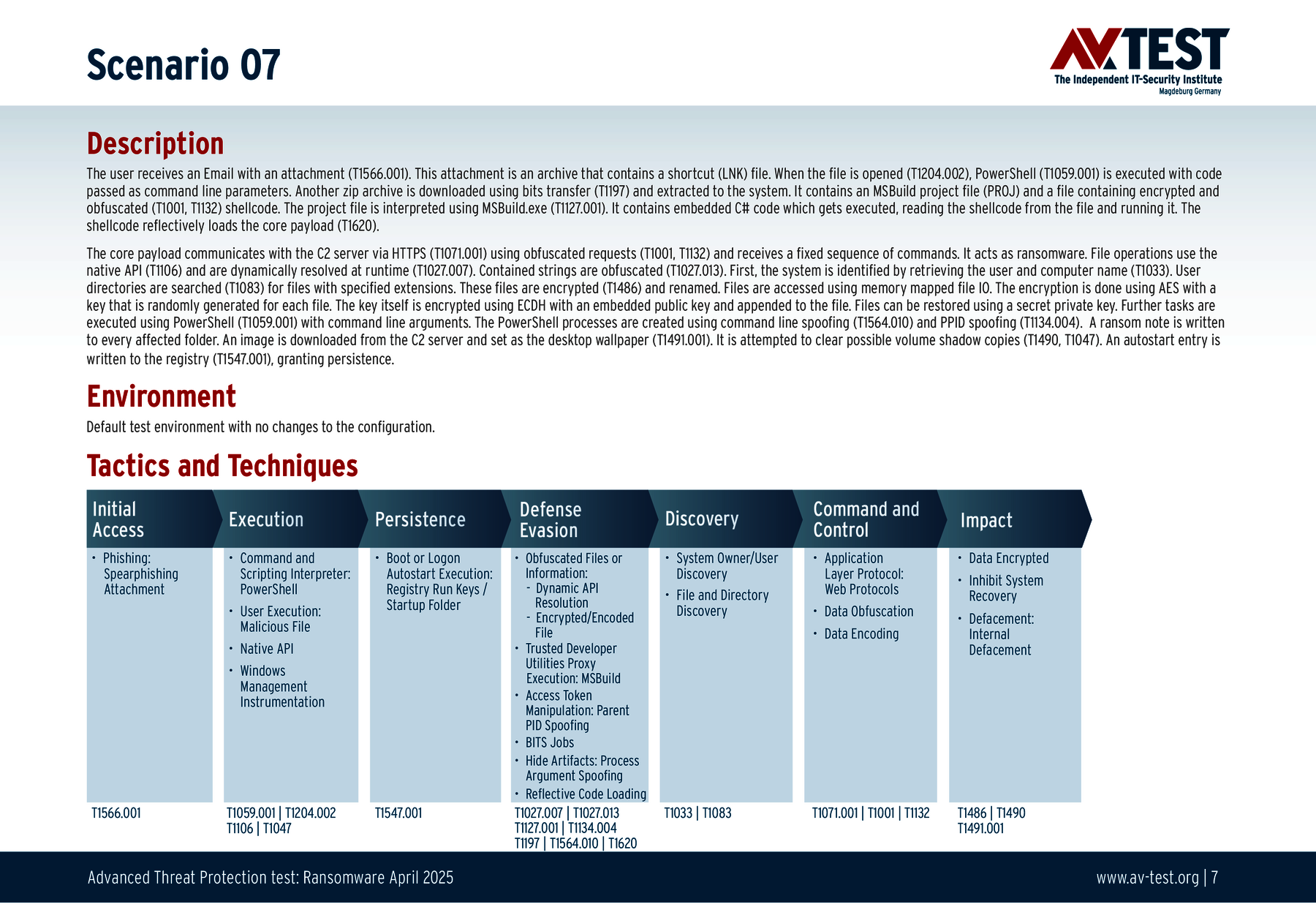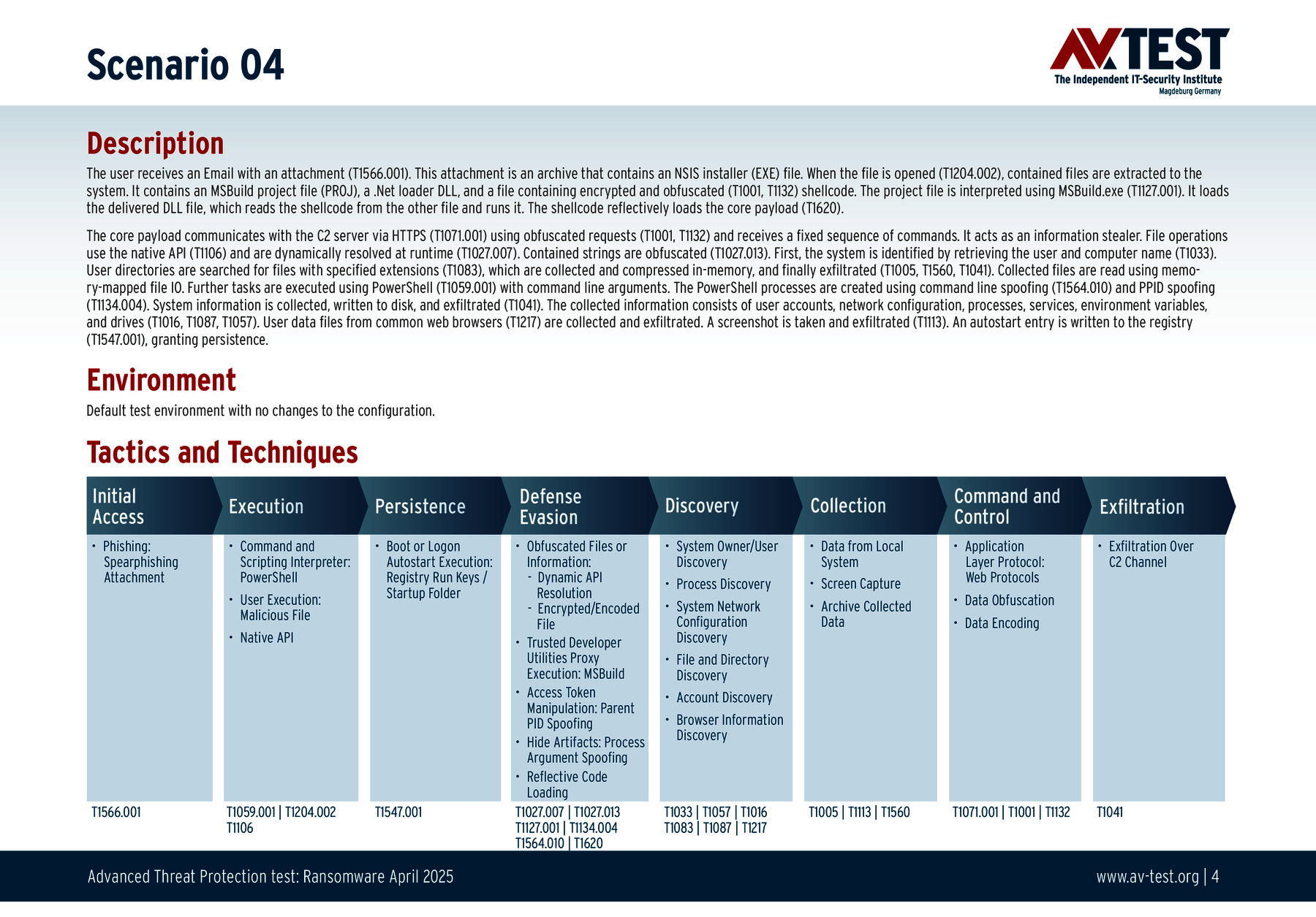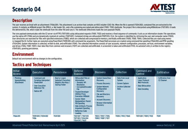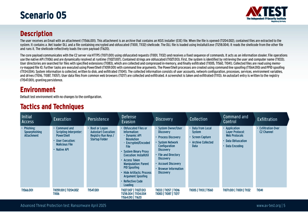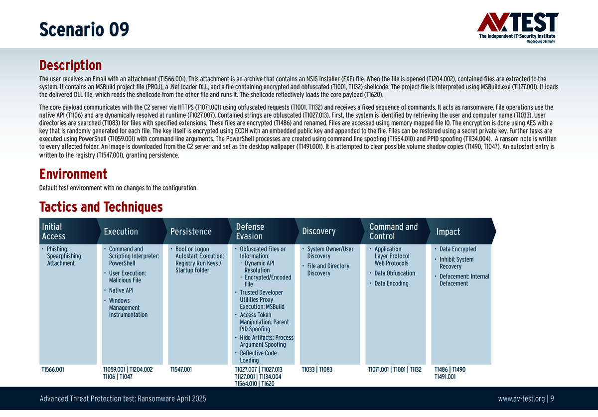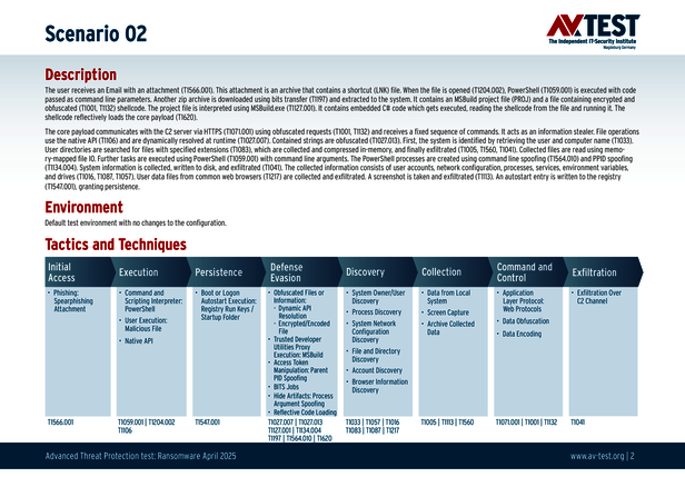 Todos los escenarios de ataque están documentados de acuerdo con los estándares de la base de datos de MITRE ATT&CK. Los diferentes subpuntos, por ejemplo “T1566.001”, aparecen en la base de datos de MITRE para “Techniques” bajo “Phishing: Spearphishing Attachment”. Cada paso de la prueba, por lo tanto, está definido por especialistas y es trazable y comprensible. Además se explican todas las técnicas de ataque y cómo se hace uso del malware en ellas.