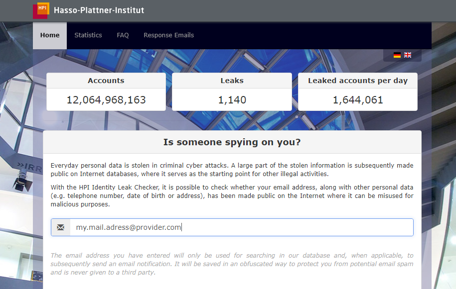 El instituto alemán Hasso-Plattner-Institut ofrece también una comprobación de seguridad de direcciones de e-mail. Sin embargo, la legislación sobre protección de datos (RGPD) no permite proporcionar una valoración inmediata en pantalla. Por eso, el instituto envía un correo a la dirección comprobada con un análisis muy extenso.