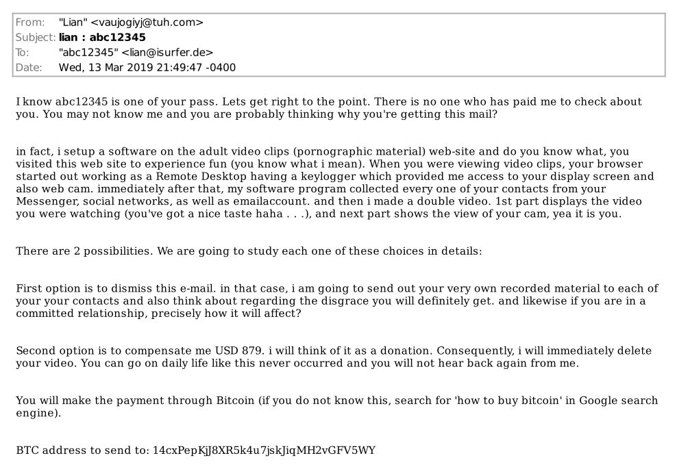 El segundo tipo de correo más usado recurre al efecto de “Blame & Shame“, es decir “acusar y avergonzar“. El remitente del correo spam afirma haber grabado al destinatario, con ayuda de su propia cámara web, mientras este consumía contenido para adultos, por ejemplo, pornografía. El extorsionador exige en el correo una suma en Bitcoins para evitar que envíe la grabación o las fotos a familiares, conocidos, amigos o su empleador. El modelo aquí es el mismo. Se exige una cantidad de Bitcoins, que hay que transferir al monedero digital (Wallet) indicado. Si lo hace, se eliminará la grabación o las fotos de forma segura.