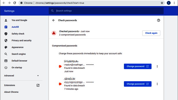 Quien usa una cuenta de Google y, por tanto, está registrado en su navegador, puede almacenar allí sus datos de cuenta y sus contraseñas. Todos estos datos de acceso se pueden comprobar de forma manual o automática con ayuda del navegador. Esto es posible, por ejemplo, en Chrome (y también en Firefox y Edge) yendo a “Configuración“, “Comprobación de seguridad“ y seleccionando “Comprobar“ en el punto Contraseñas. Allí se encuentran todos los datos de la cuenta con la indicación “Contraseña comprometida“. Si en una página web se utilizan datos de inicio de sesión hechos públicos, Chrome lo notifica de inmediato y exhorta al usuario a que compruebe todos los demás datos de inicio de sesión.
