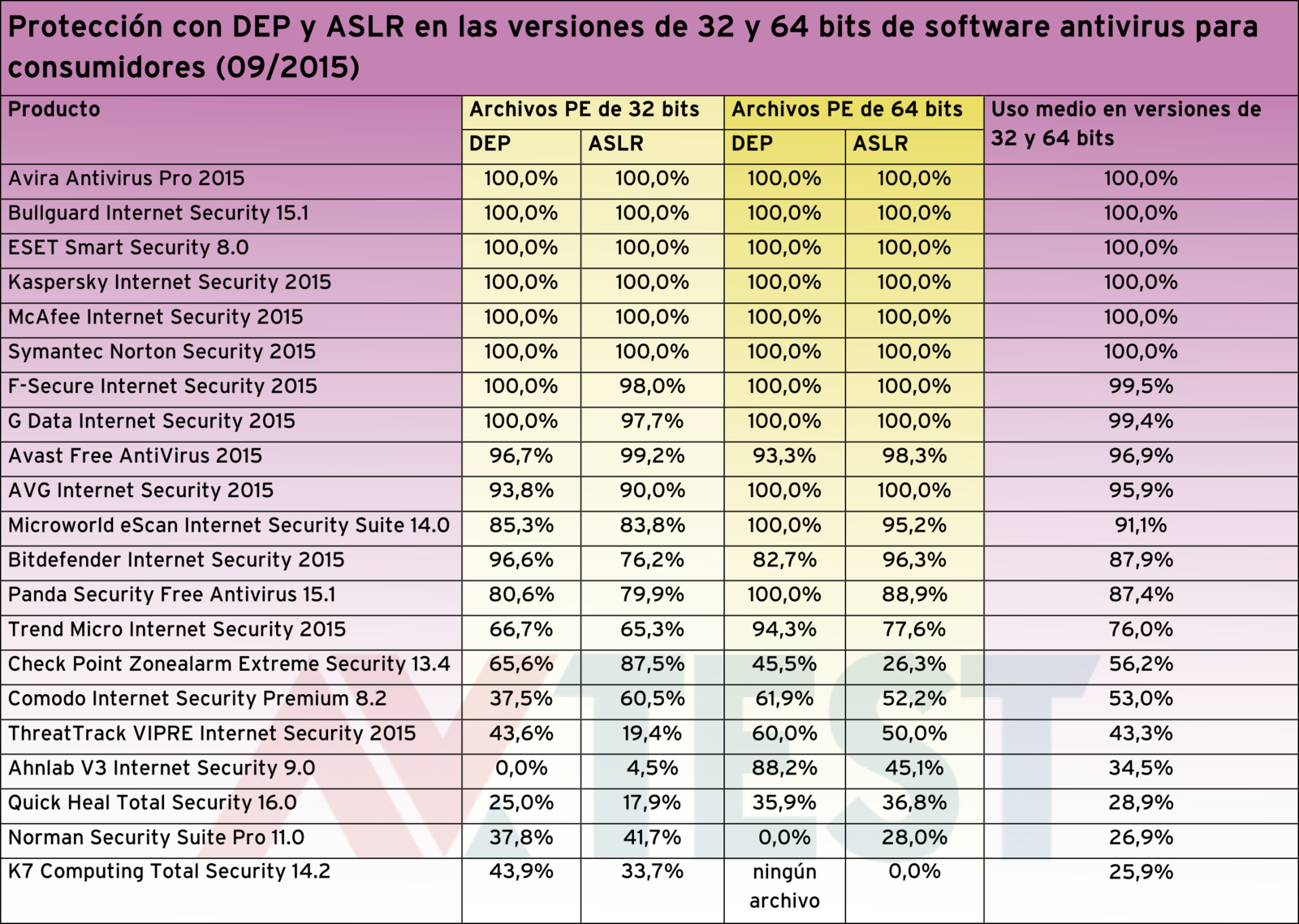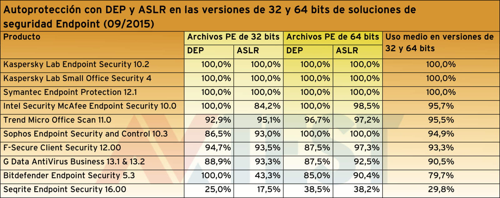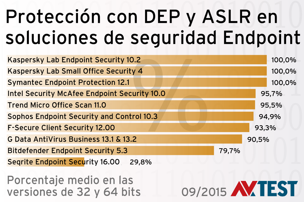Mientras que solo una de las soluciones para usuarios privados comprobadas el año pasado contaba con un 100 por cien de protección mediante DEP y ASLR, en la prueba actual son 6 los productos que lo hacen. Los fabricantes son Avira, Bullguard, ESET, Kaspersky McAfee y Symantec. Otros dos paquetes han conseguido una valoración del 99,4 y 99,5 por ciento: F-Secure y G Data. A partir de ahí y al igual que el año pasado, la puntuación desciende poco a poco hasta el mínimo de solo un 25,9 por ciento.