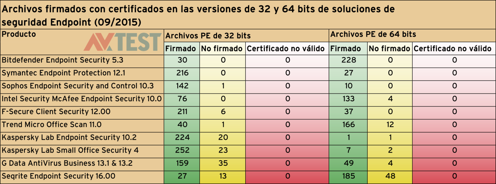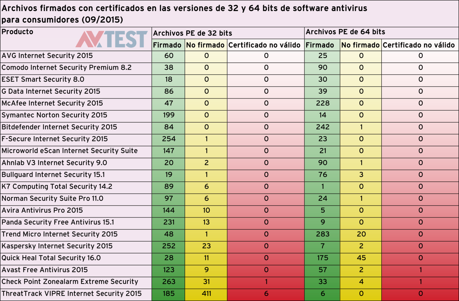 De los productos para consumidores, los de Avira, Bullguard, ESET, Kaspersky Lab, McAfee y Symantec aplican al 100 por cien las técnicas DEP y ASLR. En cuanto a la firma de los archivos, ESET, McAfee y Symantec también han hecho un buen trabajo. A Avira, Bullguard y Kaspersky aún le quedan algunos archivos por firmar, aunque no sean muchos.