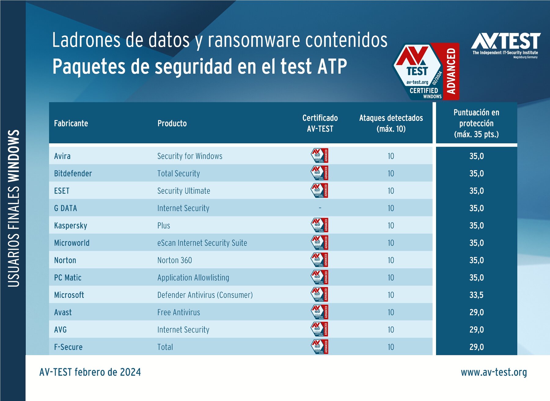 En la prueba ATP de enero y febrero 2024 participaron 12 productos para usuarios privados y 13 soluciones para terminales de empresas. Los paquetes de protección para usuarios finales proceden de Avast, AVG, Avira, Bitdefender, ESET, F-Secure, G DATA, Kaspersky, Microsoft, Microworld, Norton y PC Matic.