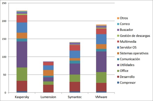 la gama de programas de la solución Kaspersky Lab es, con casi 230 aplicaciones, la más amplia. Lumension no reconoce ni 90 programas.