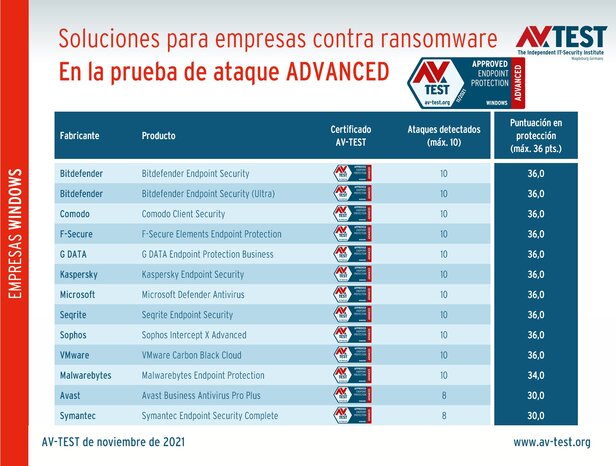 En el Advanced Threat Protection test de las 15 soluciones de seguridad en Internet, 9 de los 15 paquetes demostraron en la práctica que protegen bien contra el ransomware. Los siguientes productos superaron los 10 escenarios de ataque y obtuvieron la máxima puntuación de 36 en protección: Bitdefender Internet Security, F-Secure SAFE, G Data Total Security, Kaspersky Internet Security, Microsoft Defender, Microworld eScan Internet Security Suite, PC Matic, Quick Heal Total Security y VIPRE AdvancedSecurity.