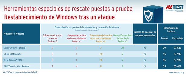 Kaspersky también lidera la tabla de las herramientas con su Virus Removal Tool, que consiguió un resultado casi perfecto y un rendimiento de limpieza de un 97,5 por ciento. Solo dejó restos de archivo no peligrosos en dos ocasiones.