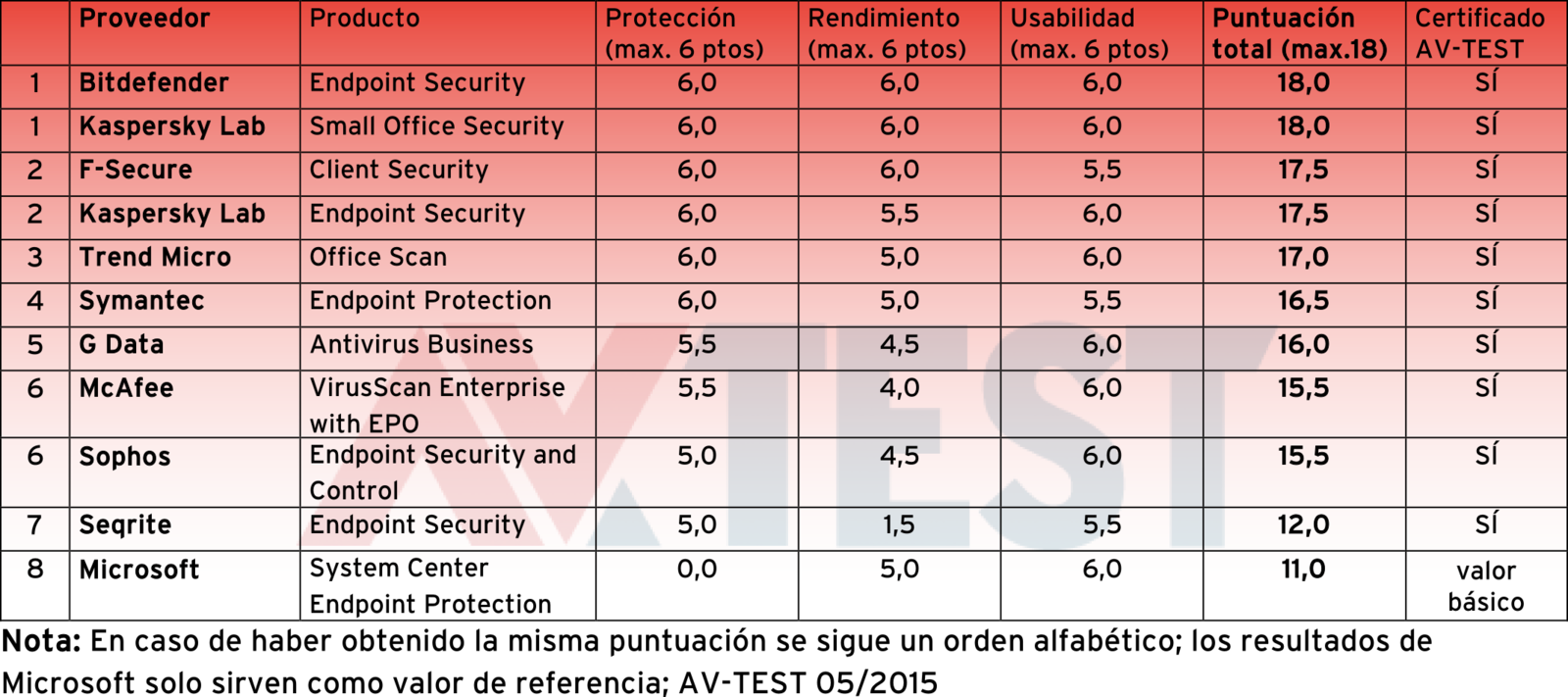 Bitdefender y Kaspersky con su Small Office Security obtuvieron en la prueba la máxima puntuación de 18 (AV-TEST, mayo de 2015).