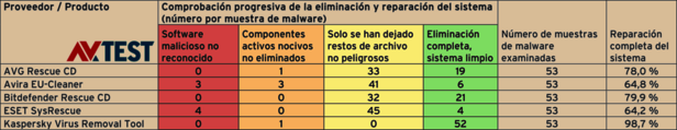 Las herramientas AVG Rescue CD, Bitdefender Rescue CD y Kaspersky Virus Removal Tool ofrecieron una mejor actuación. No obstante, AVG y Kaspersky en un caso no pudieron eliminar los componentes activos del malware, a pesar de detectarlo. La herramienta de Bitdefender fue la única que superó los dos primeros obstáculos de la detección y la eliminación sin ningún fallo.