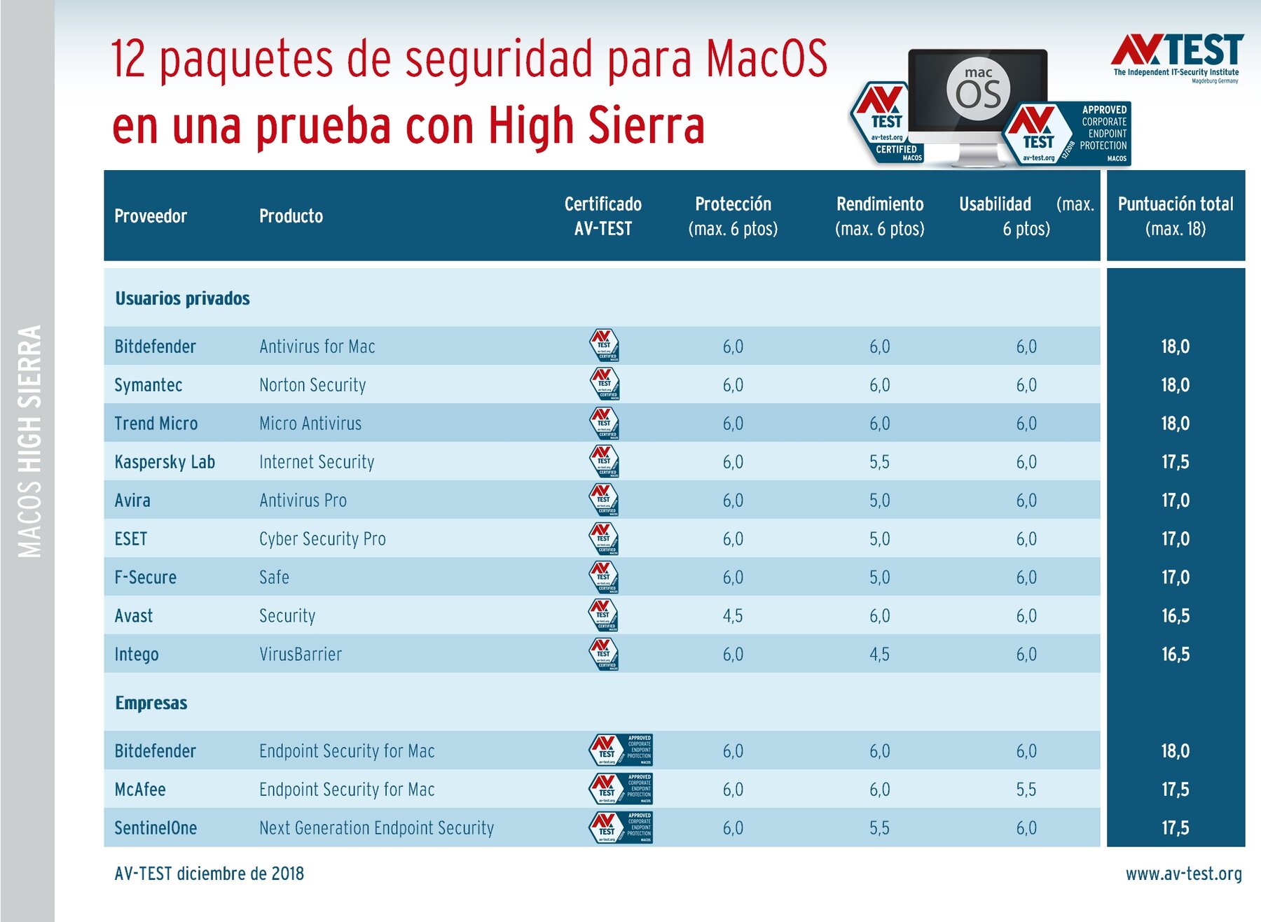 La soluciones de seguridad para usuarios privados y empresas se examinaron usando iMacs idénticos con MacOS High Sierra 10.13.3. La prueba consiste en tres secciones: la protección, el rendimiento y la usabilidad. En el último punto se trata principalmente de las falsas alarmas generadas por los paquetes. En cada sección, una solución puede conseguir hasta 6 puntos, es decir, en total, 18 como máximo.