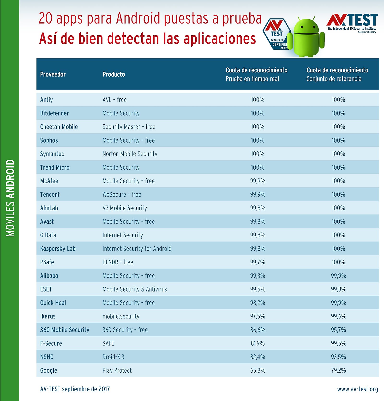 Las 6 aplicaciones de Antiy, Bitdefender, Cheetah Mobile, Sophos, Symantec y Trend Micro detectaron en la prueba el 100 por cien del malware. Otras 7 aplicaciones solo cometieron pequeños fallos en el caso de las amenazas nuevas y obtuvieron tasas de detección del 99,9 al 99,7 por ciento en la prueba en condiciones reales: McAfee, Tencent, AhnLab, Avast, G Data, Kaspersky Lab y PSafe. Todas las demás aplicaciones registraron valores inferiores en detección.
