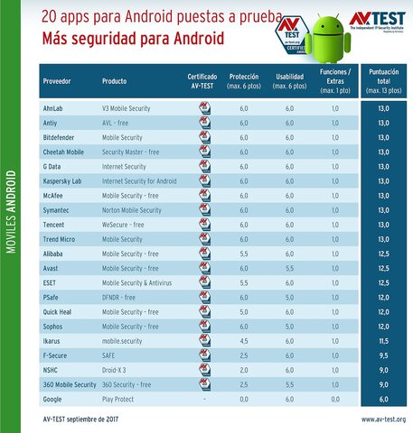 6 aplicaciones detectaron en la prueba el 100 por cien de los atacantes, mientras Google Play Protect obtuvo el peor resultado.