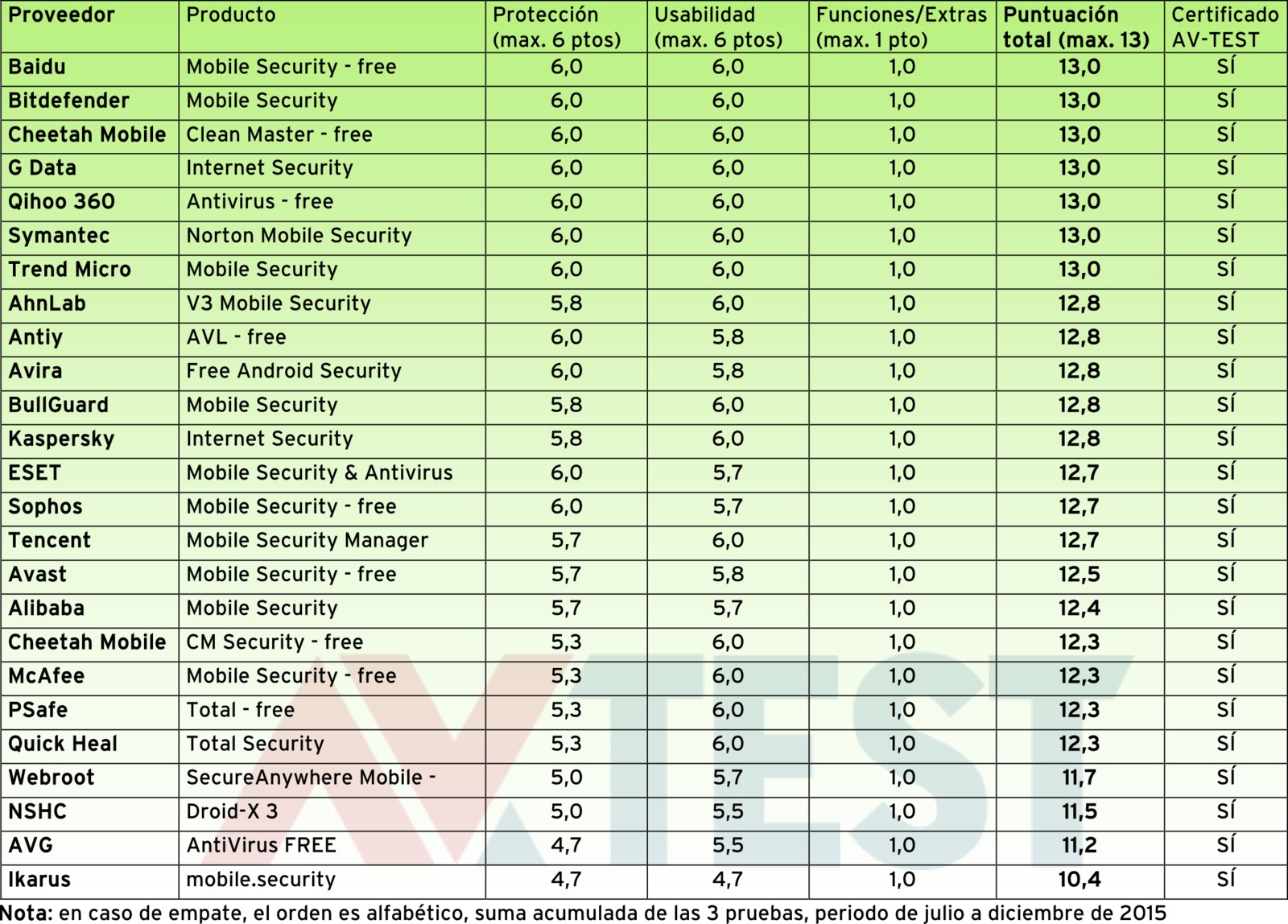 Cada aplicación podía alcanzar un máximo de 13 puntos. Esta puntuación máxima en la prueba de larga duración la obtuvieron 7 aplicaciones de Baidu, Bitdefender, Cheetah Mobile (Clean Master), G Data, Qihoo 360, Symantec y Trend Micro. Otras 9 aplicaciones las siguieron de cerca con entre 12,5 y 12,8 puntos. Muchas de las mejores aplicaciones son incluso gratuitas.