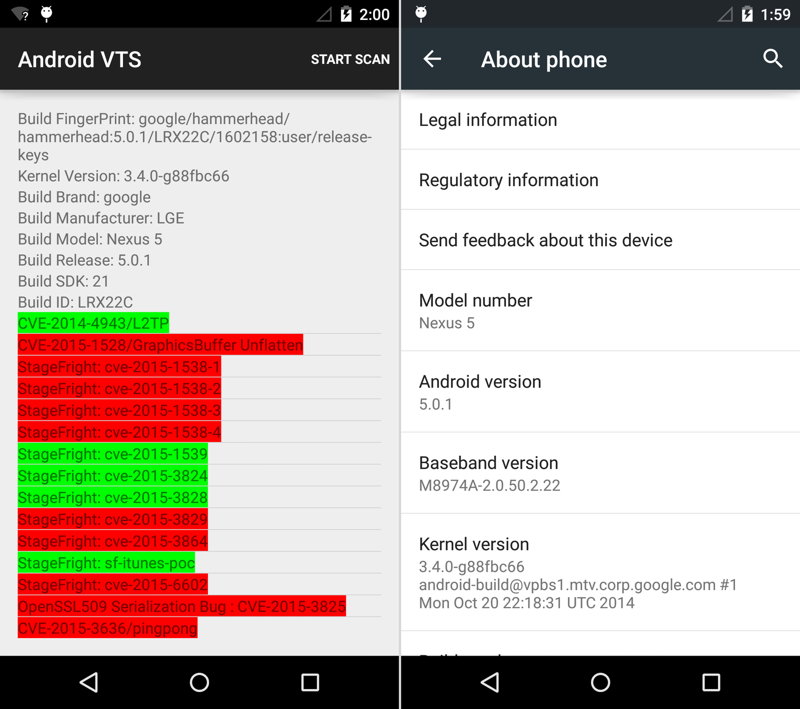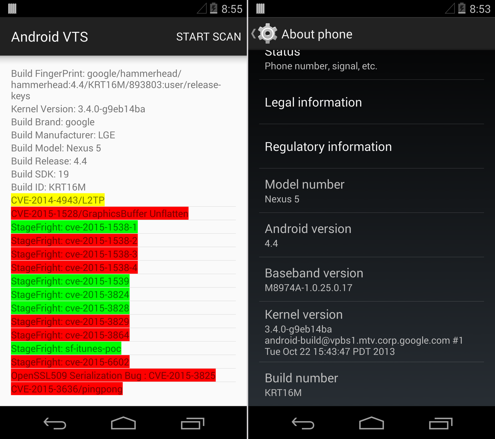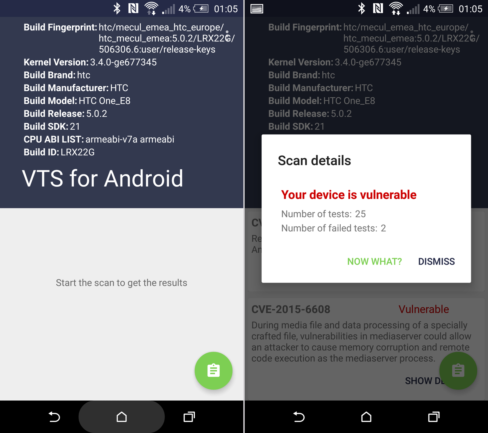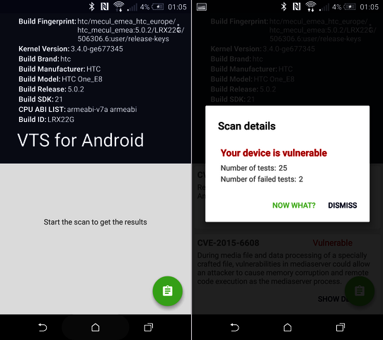 Desde las primeras versiones de Android es un hecho que también en el sistema operativo de Google se hallan una y otra vez agujeros de seguridad. Si el sistema es hasta cierto punto actual, suele haber disponible una actualización de Google para taparlos. Pero esto no significa en absoluto que los fabricantes de dispositivos móviles, como Samsung, LG o HTC, procesen la actualización y la ofrezcan a sus clientes. Para las versiones antiguas de Android no suele haber actualizaciones y los usuarios tienen que apañárselas solos. Quien quiera poner a prueba la versión de Android con la que cuenta, puede hacerlo con la aplicación gratuita "VTS for Android" (de GitHub). De forma sorprendente, Google ha excluido la aplicación de la tienda aludiendo problemas de seguridad. Quizás a Google la aplicación le resulte demasiado directa. La aplicación nombra todos los agujeros de seguridad del sistema Android instalado y las correspondientes CVEs, es decir, vulnerabilidades comunes y exposición (Common Vulnerabilities and Exposures). Una aplicación de seguridad no puede cerrar los agujeros, pero al menos puede detener y eliminar las aplicaciones que se cuelen por los puntos débiles.