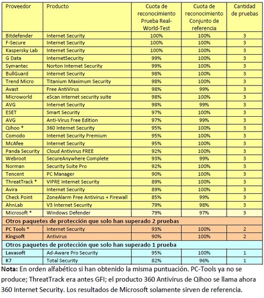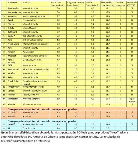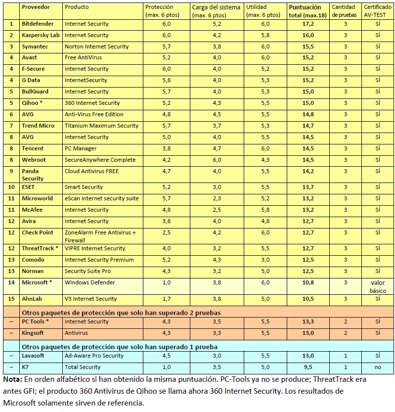 Casi la misma sucesión se manifiesta en la clasificación definitiva. Mientras que Bitdefender, Kaspersky Lab y Symantec lideran la tabla, los paquetes de protección de Avast, F-Secure y G Data comparten el cuarto puesto.