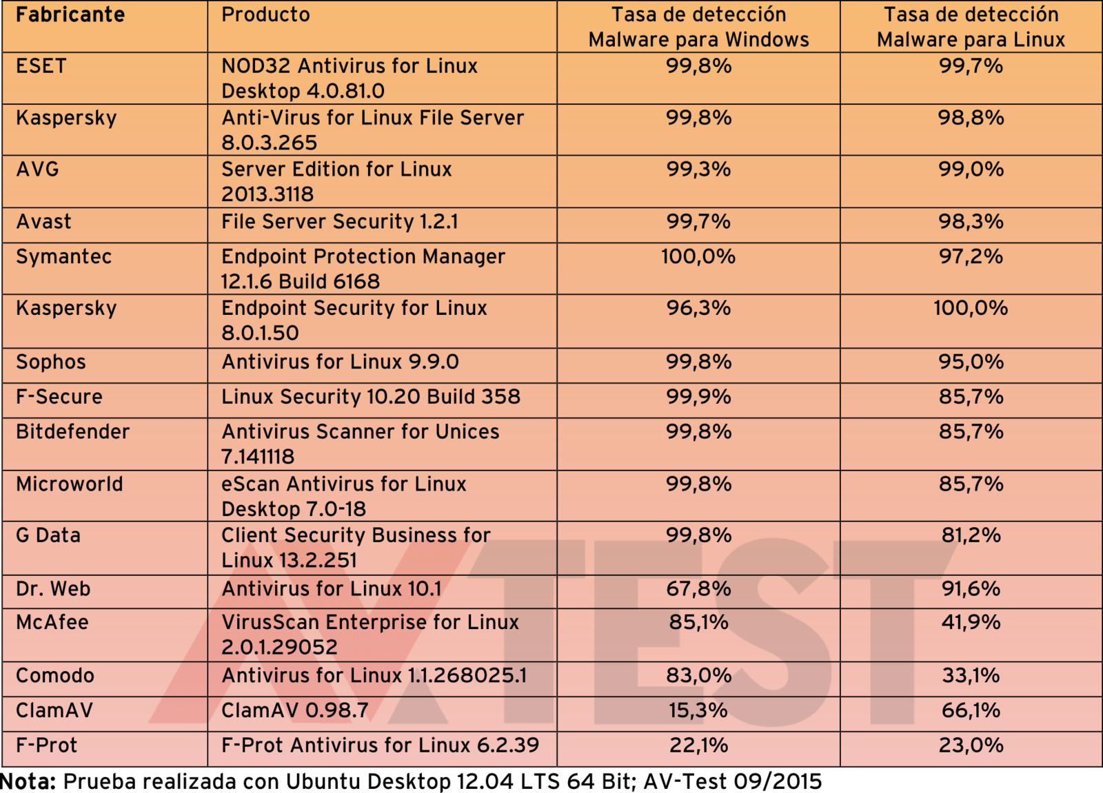 En el laboratorio de AV-TEST se evaluaron 16 soluciones de seguridad para sistemas Linux. La mayoría de las soluciones están pensadas para PCs de sobremesa, el resto para servidores. Como entorno para la prueba se usó la distribución Ubuntu, ya que es considerada la plataforma más extendida. Se utilizó la versión Desktop 12.04 LTS 64 Bit (Kernel 3.13.0-54). En la prueba participaron soluciones de seguridad para Linux de Avast, AVG, Bitdefender, ClamAV, Comodo, Dr. Web, eScan, ESET, F-Prot, F-Secure, G Data, Kaspersky Lab (con dos versiones), McAfee, Sophos y Symantec. La prueba se dividió en tres partes: la detección de malware para Windows, la detección de malware para Linux y la prueba de falsos positivos.