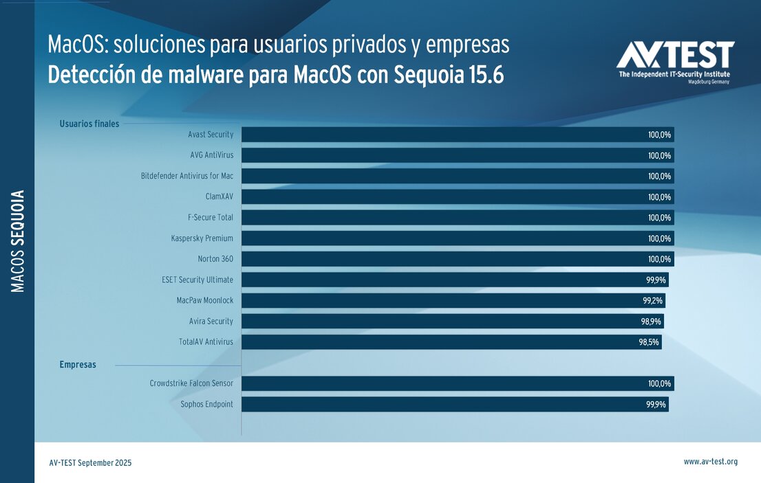 El laboratorio de AV-TEST examina cada trimestre una amplia oferta de soluciones de seguridad para MacOS. Para esta prueba se tomó como base la versión mejorada por Apple MacOS Sequoia 15.6.