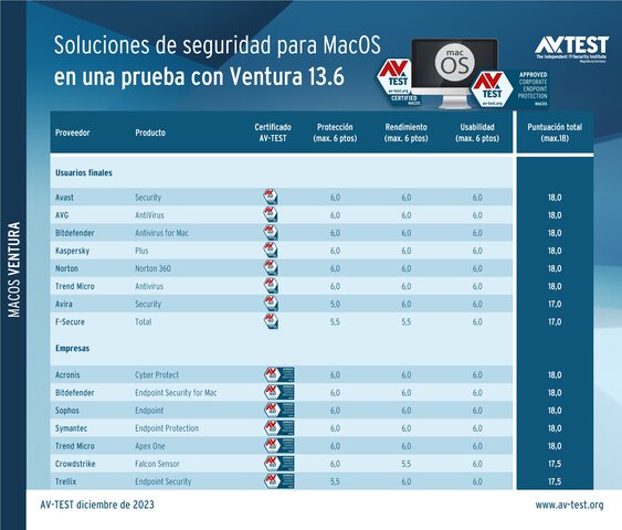 El laboratorio de AV-TEST probó 7 soluciones empresariales y 8 paquetes de seguridad para usuarios privados con MacOS Ventura 13.6 en diciembre de 2023. Su actuación fue sometida a escrutinio y valorada en las categorías de protección, rendimiento y usabilidad. El último punto comprueba, principalmente, posibles falsas alarmas generadas por los productos de seguridad. En cada sección de la prueba un producto puede obtener hasta 6 puntos. La máxima puntuación total asciende, por tanto, a 18 puntos.