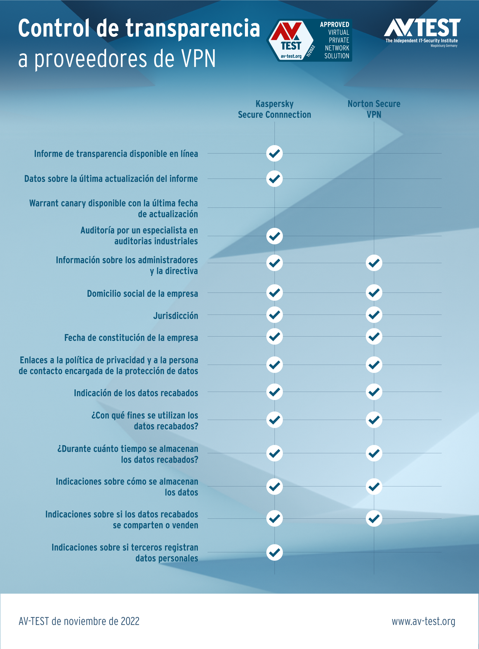 En cuestión de transparencia y confidencialidad, los fabricantes de ambos productos son socios fiables. La correspondiente tabla de transparencia muestra claramente que Kaspersky y Norton se toman en serio la esfera privada de sus clientes. También indica que ninguna de las dos empresas recopila más datos de los necesarios, que publican sus políticas de protección de datos y cuentan con delegados de protección de datos en esta materia. Kaspersky incluso publica siempre un informe de transparencia.