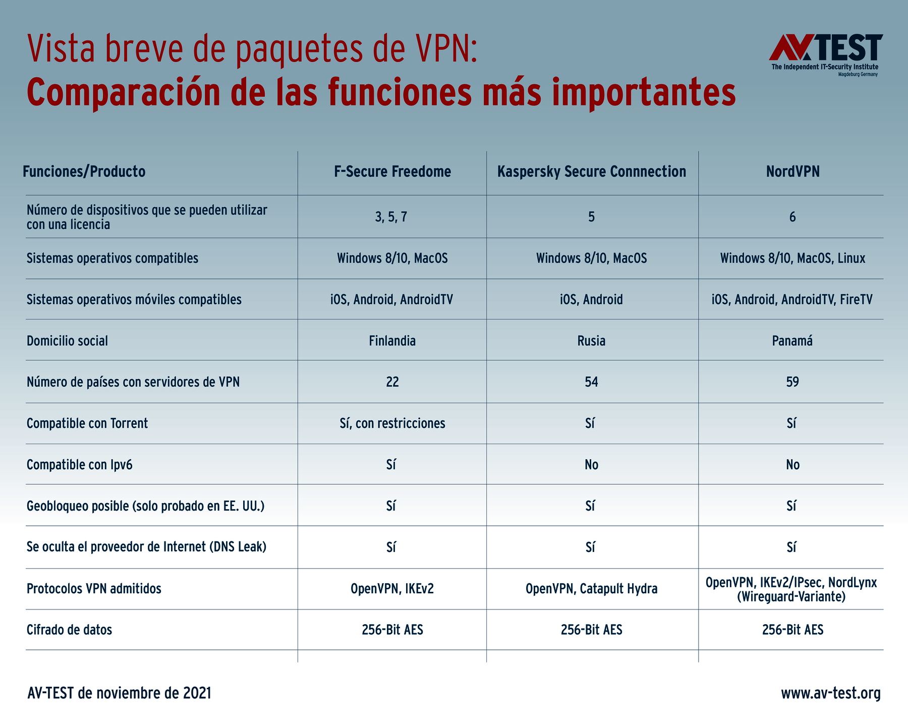 La tabla muestra también una vista general, no puntuada, de los extras y las funciones de los paquetes de VPN.